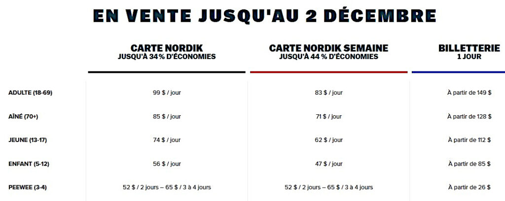 Votre horaire vous permet de profiter de la montagne en semaine? Optez pour la Carte Nordik Semaine et skiez de 2 à 4 jours à Tremblant pendant toute la saison prochaine, à un tarif encore plus avantageux – jusqu’à 44 % d’économies. Les journées peuvent être utilisées à votre guise, du lundi au vendredi, selon le calendrier suivant.