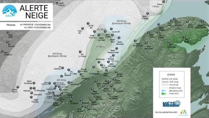 Alors que sont tombés nos premiers centimètres officiels de la saison dans quelques régions de la province, nos regards doivent rapidement se tourner vers les journées de dimanche et lundi: un système dépressionnaire en provenance du mid-ouest américain devrait nous apporter notre première chute de neige significative pour novembre. Jetons un coup d’oeil sur les prévisions!