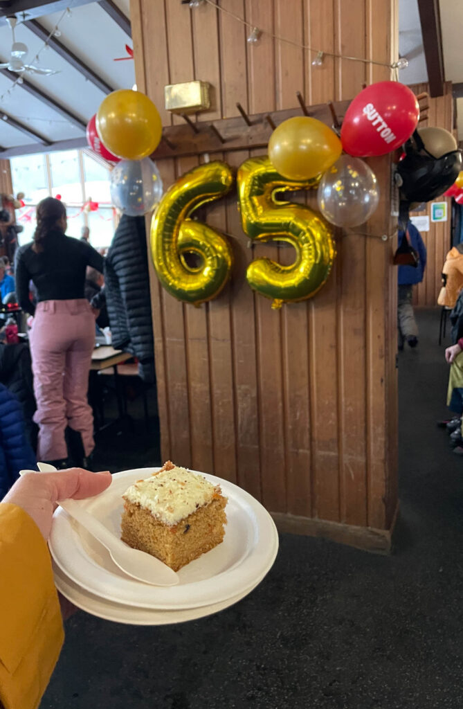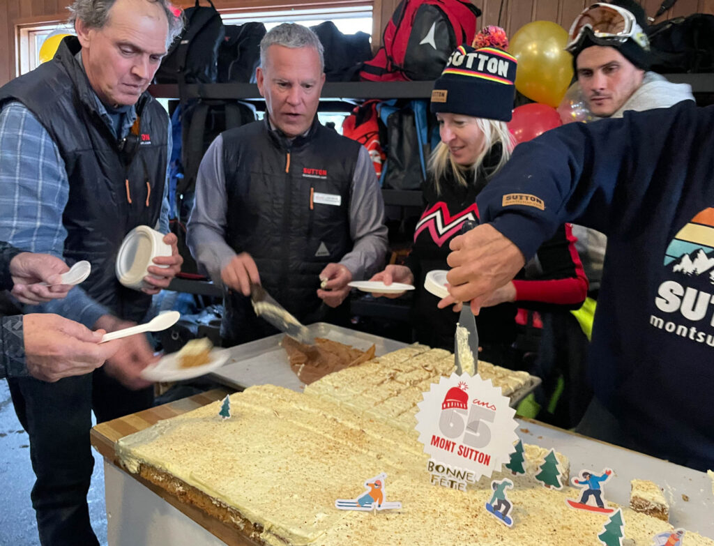 On prend une petite pause pour aller savourer le gâteau du 65e anniversaire. On sert les clients et on réserve des parts pour les employés qui participent au succès et à la pérennité de la station. Longue vie au Mont SUTTON!