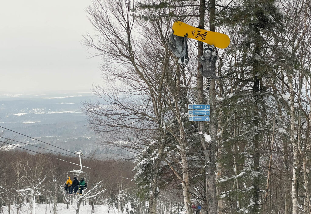 Sous l’oeil amusé du duo de ratons, les visiteurs fourchent à droite ou à gauche en débarquant du télésiège II -cette droite-là!? Non, l’autre droite!