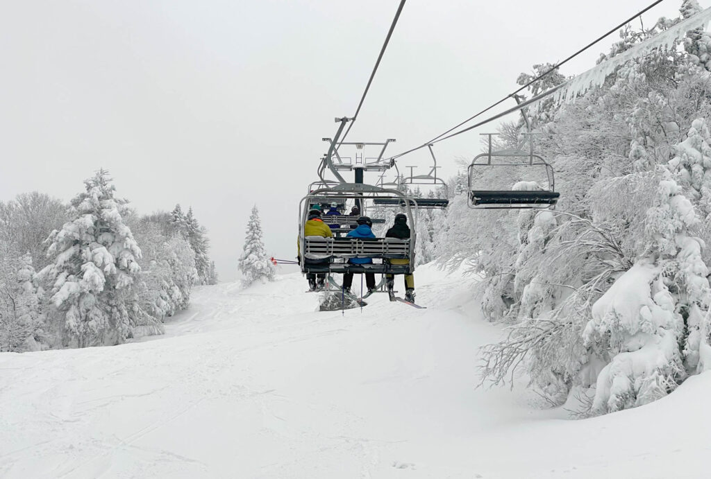 Sans les skieurs dans la chaise devant, on croirait cette photo en noir et blanc. Ce type de cliché est fréquent au Mont SUTTON… Ce qui le rend exceptionnel, c’est la date du 17 décembre: les arbres sont chargés comme après une tempête de janvier, et la couverture neigeuse en piste est tout aussi généreuse.