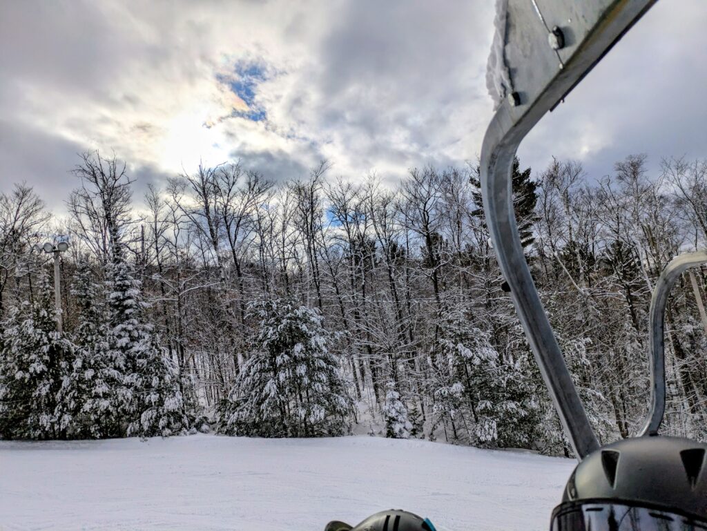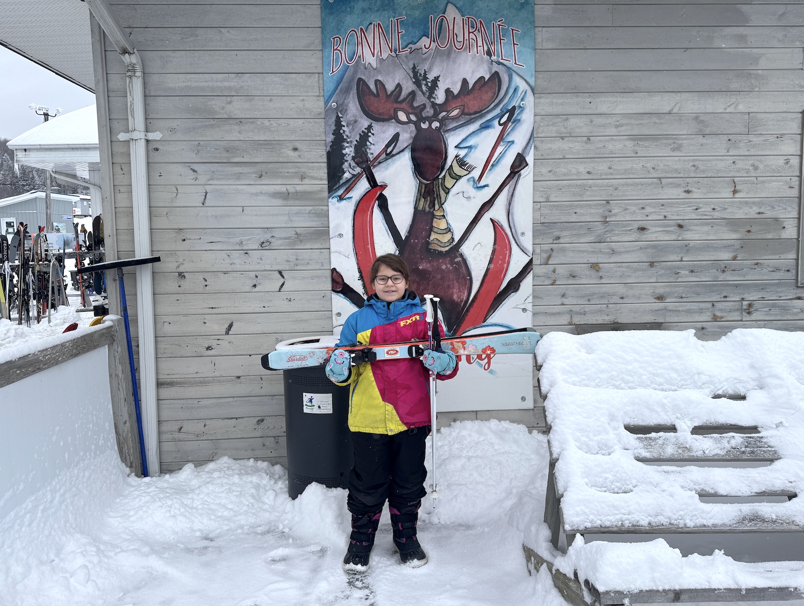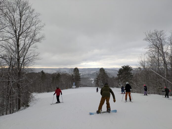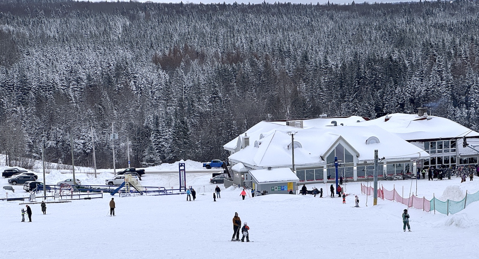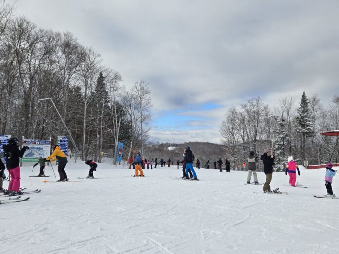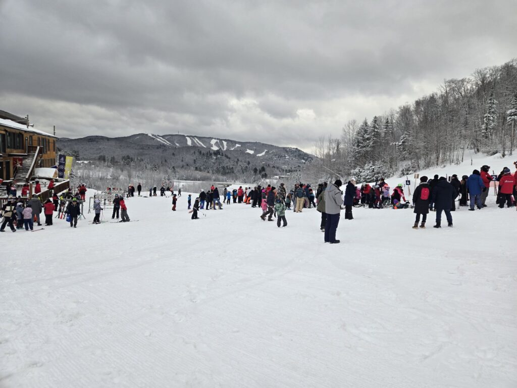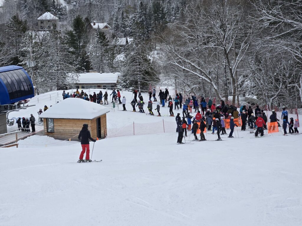 Après une nuit et un début de matinée laissant près d’une dizaine de cm de neige, l’ambiance est festive au Mont Orignal. Accompagné de ma fille Léa, je fus heureux d’économiser un peu d’argent puisque c’est la journée familiale Desjardins donnant un billet gratuit aux enfants de 8 ans et moins ainsi que divers rabais aux membres de l’institution financière. Il va sans dire que la pente-école et sa remontée mécanique Poma furent très populaires aujourd’hui!