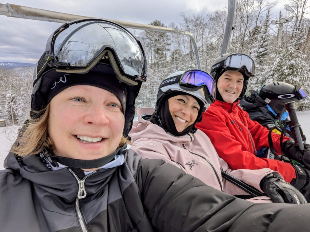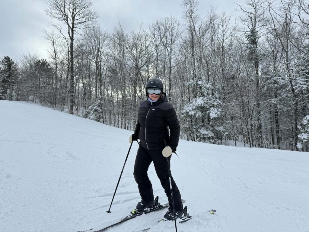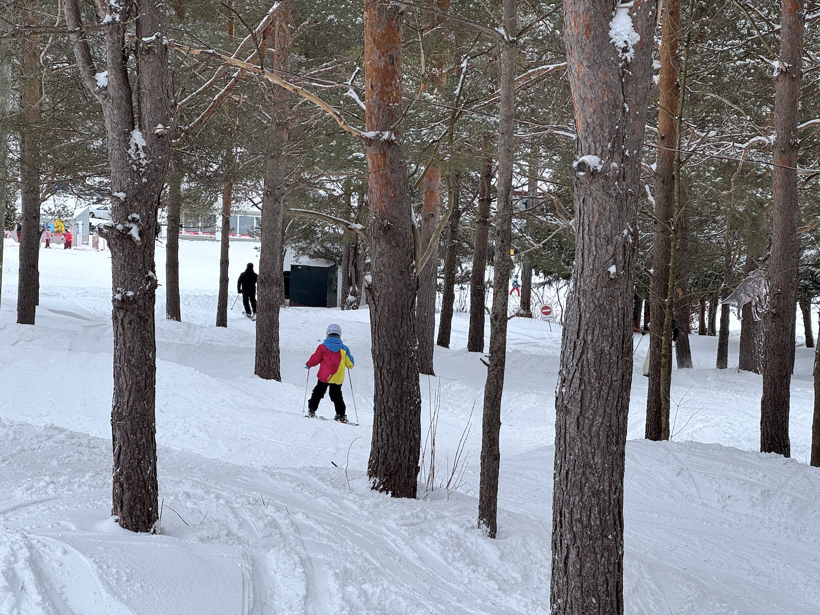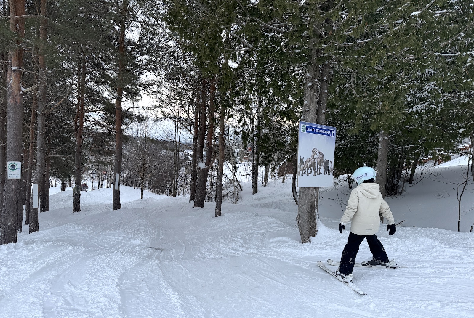 Ma fille a fait une vilaine chute dans la piste familiale lors de notre première descente. Un (très jeune) patrouilleur nous a rapidement été envoyé et son intervention fut très professionnelle. Heureusement, il y a eu plus de peur que de mal. Nous avons ensuite pris une pause et mangé une excellente frite-sauce italienne, son repas préférée, faite avec une vraie bonne sauce maison. Sa confiance en miette, nous avons fait deux descentes dans la pente-école à très basse vitesse avant de refaire la piste familiale. La voici dans la forêt des dinosaures, fière d’avoir eu le courage de retourner skier et d’être remontée au sommet.