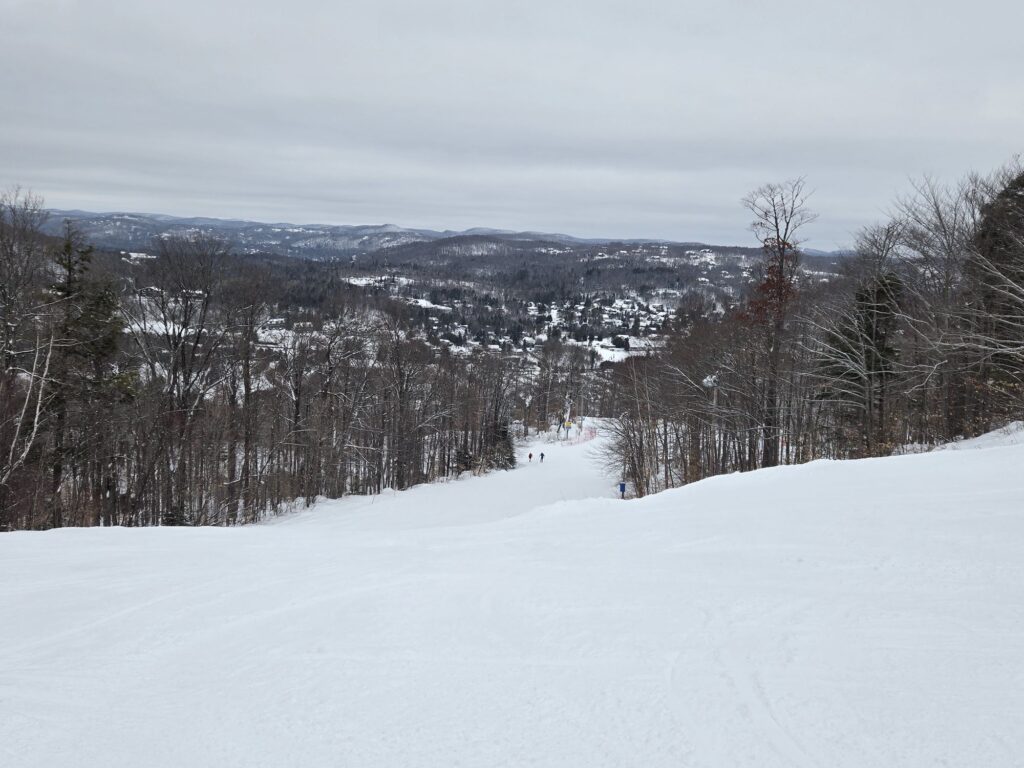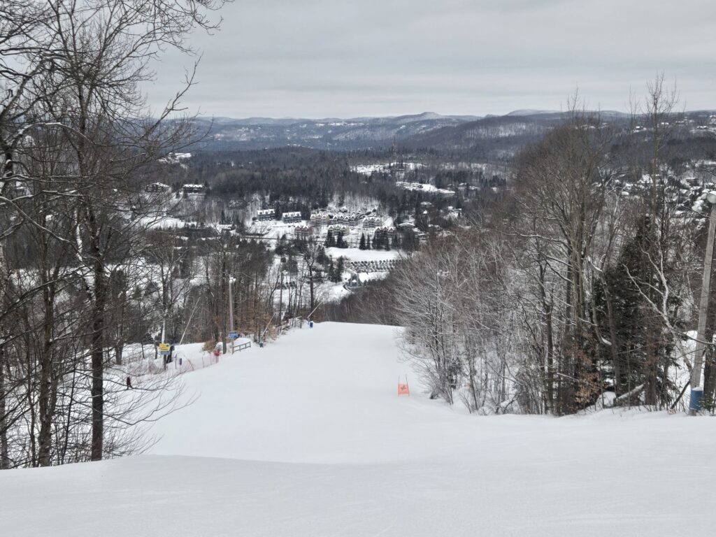 Voici la vue tout en haut de La Tuque, une autre belle piste considérée comme étant très difficile mais que j’apprécie vraiment. On aperçoit au loin les Sommets Gabriel et Olympia.