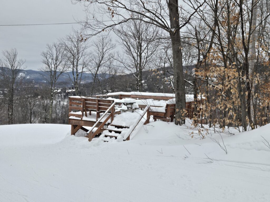 Je dois vous avouer que j’avais été invitée par M. Galarneau aujourd’hui. Il avait promis sa présence à bien des gens semblerait… Je l’ai attendu une bonne partie de la journée, il ne s’est pas présenté malheureusement. Je me suis quand même imaginée une petite pause avec lui sur cette magnifique terrasse (un peu enneigée en ce moment disons mais…) qui est située entre les pistes W’Ski et La Tuque.