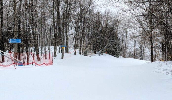 Dans la lumière grise et plate du jour, cette bannière est la bienvenue. C’est un des rares éléments contrastant sur les pistes. Mont Habitant a d’ailleurs cette qualité qu’on ne retrouve pas dans toutes les stations de ski: un balisage et une identification des pistes adéquates.