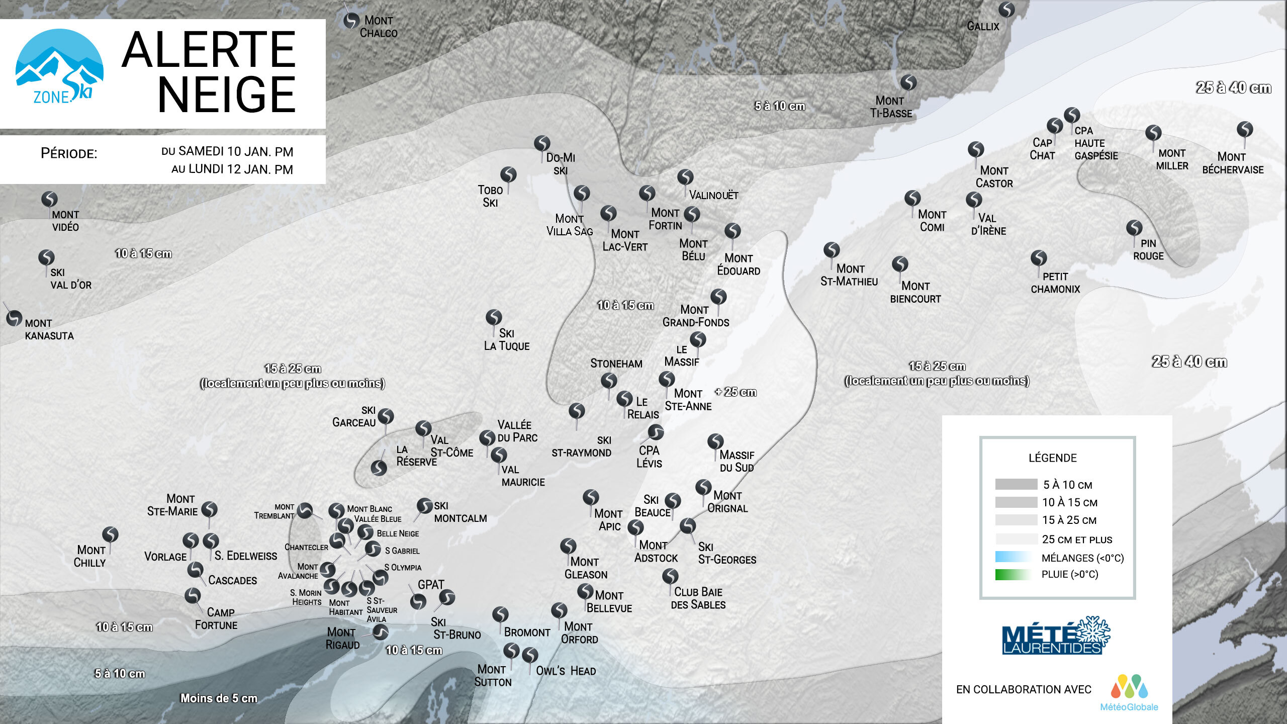 Les régions gagnantes seront Charlevoix, Chaudière-Appalaches et la pointe est de la péninsule gaspésienne: ces trois secteurs pourraient recevoir plus de 25cm localement. Cette accumulation est due à la rencontre de deux dépressions, la première venue des Grands-Lacs, la deuxième de la côte est. Celle venue de l’ouest faiblira, au profit de la dépression côtière: ce sont donc les stations situées dans la zone de rencontre des systèmes qui profiteront de l’influence des deux systèmes pour un maximum de neige.