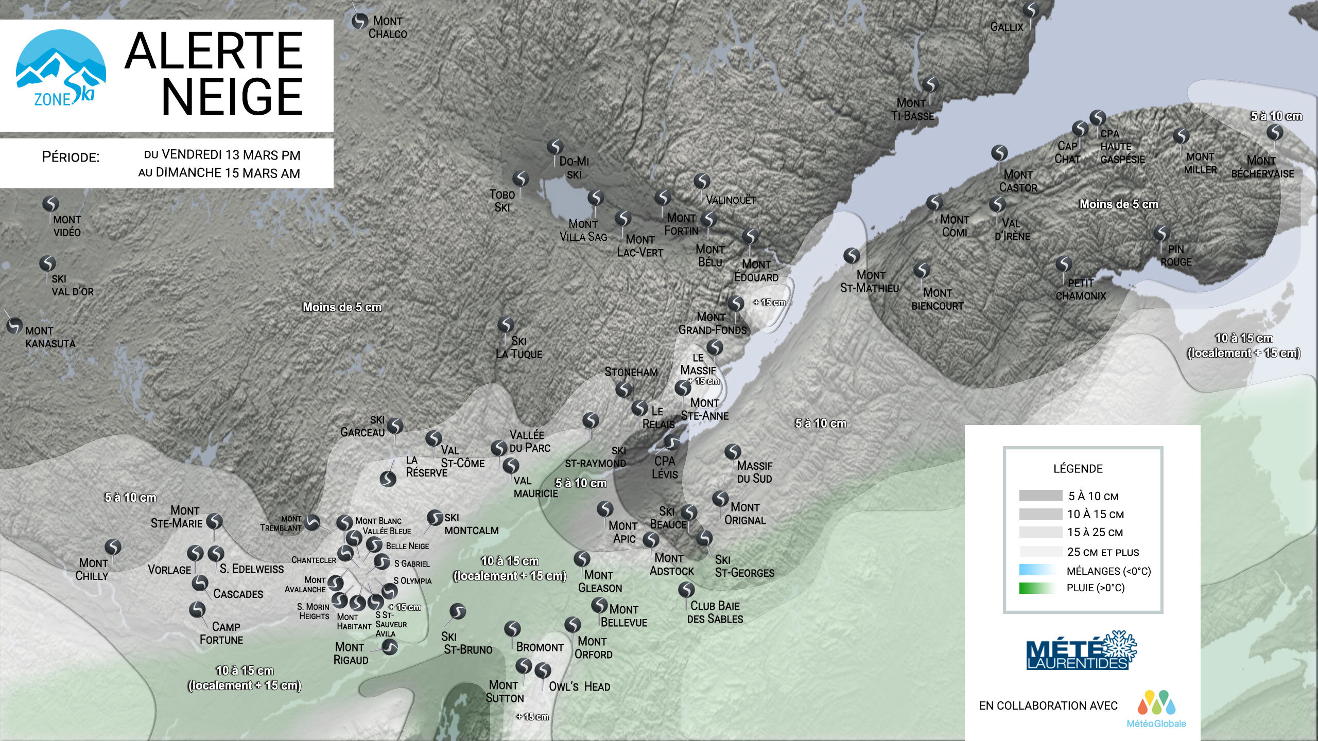 Zone.Ski et Météo Laurentides ne se tiennent aucunement responsable de toute conséquence que pourrait entraîner une prévision erronée.