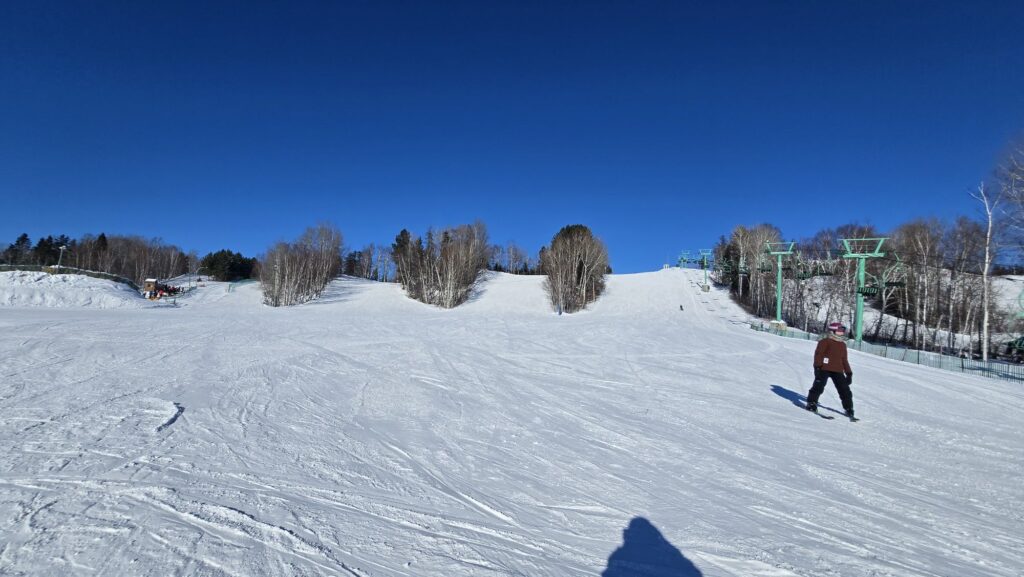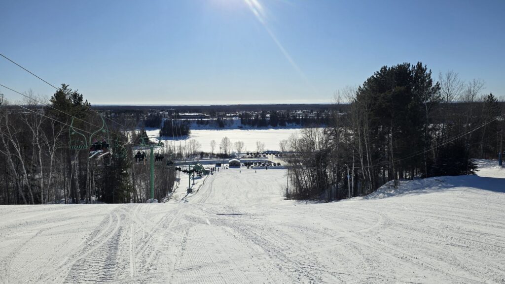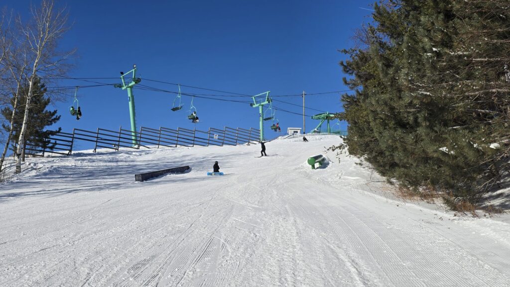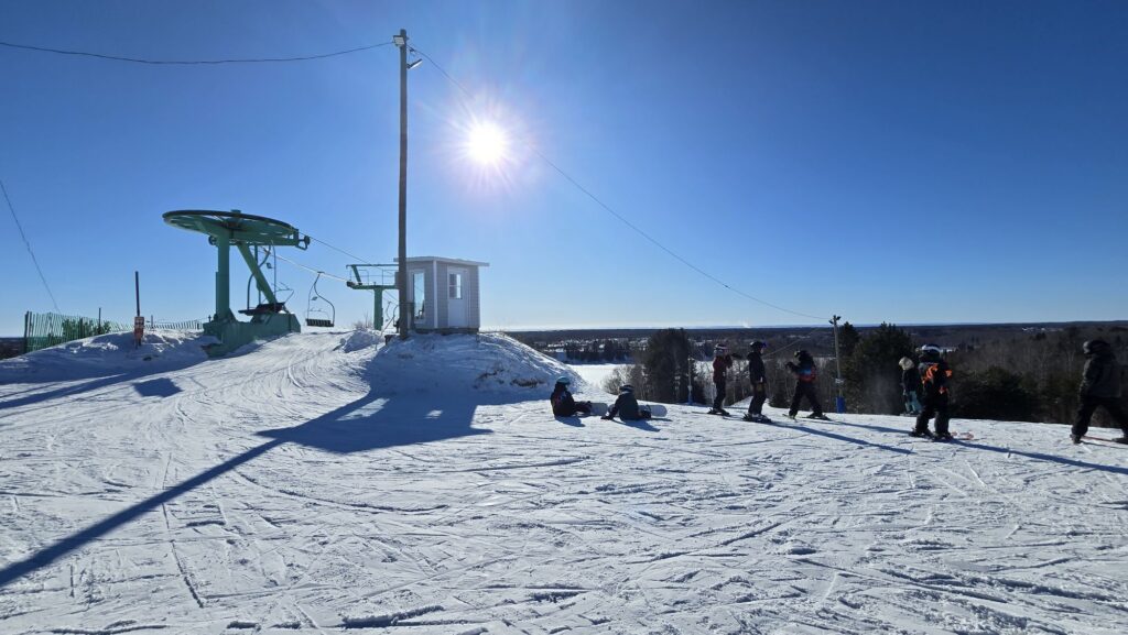 Un télésiège triple qui contient 33 sièges dessert la montagne, petite, mais pleine de rire et de jeunes heureux d’y être.