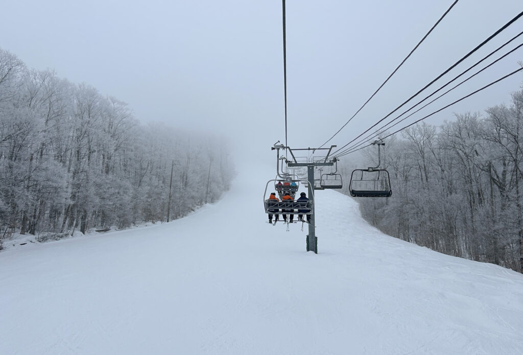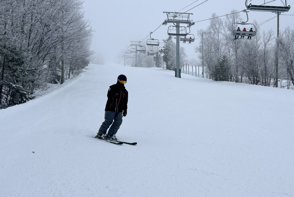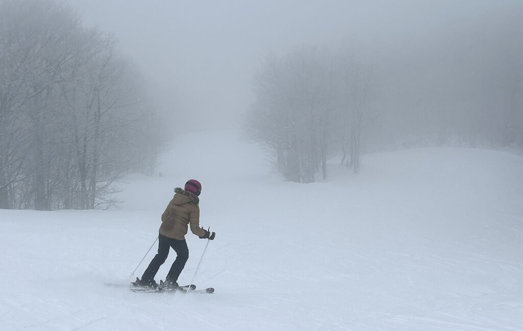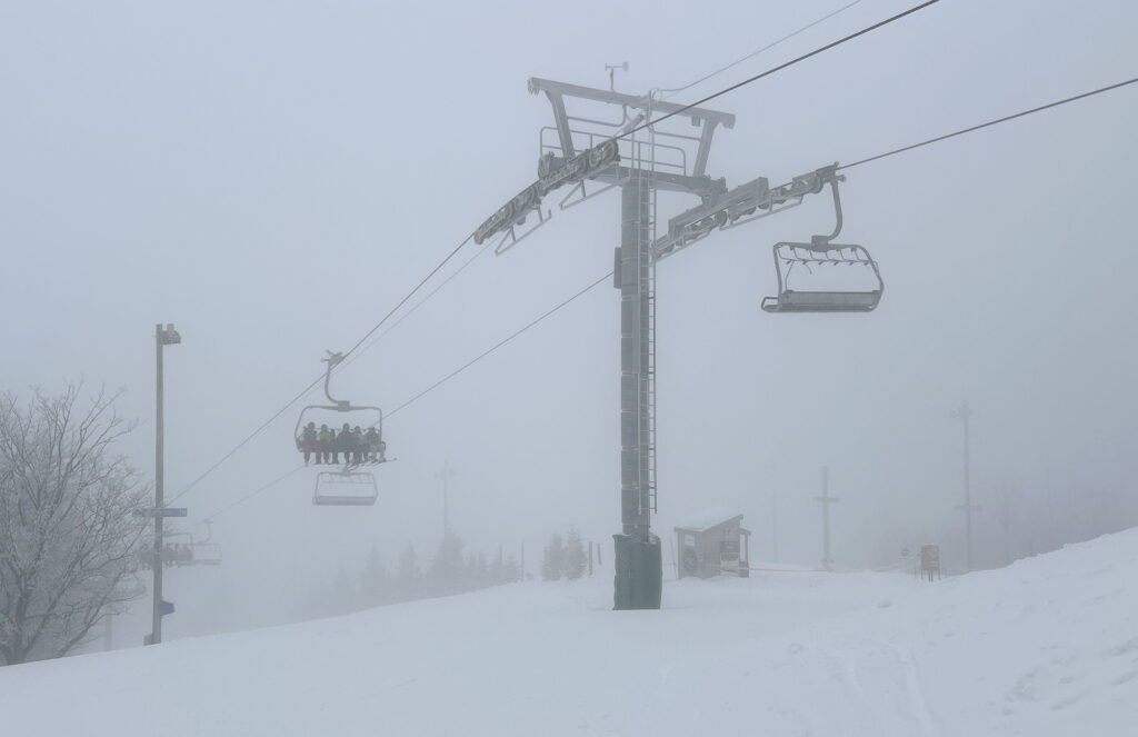 J’ai contacté Catherine qui se remet au ski cette année après plusieurs années de pause et nous nous sommes rencontrés à la station. À ma surprise, le stationnement était quand même assez rempli à mon arrivée à 9h40. Au sommet, un épais brouillard recouvrait le haut des pistes.