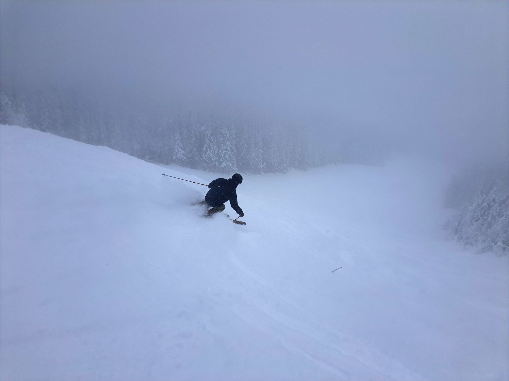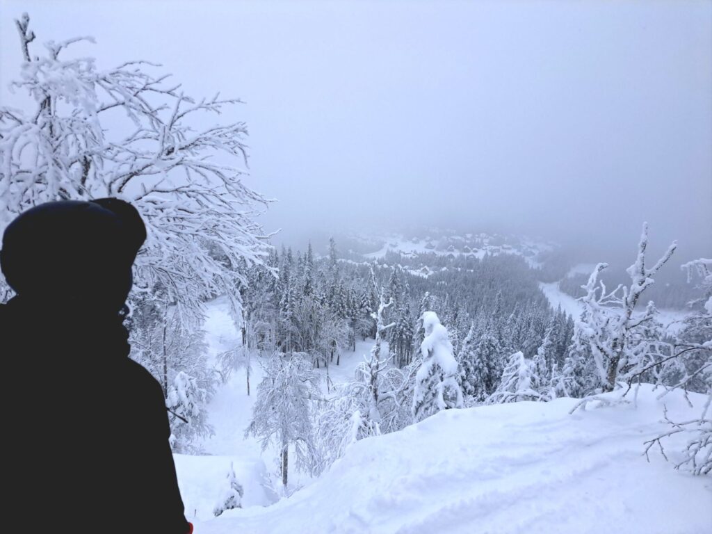 Aujourd’hui, j’ai eu le bonheur de faire des descentes au Valinouët, une montagne reconnue pour sa neige naturelle et son décor enchanteur. Dès notre arrivée, on est plongé dans un brouillard pesant.