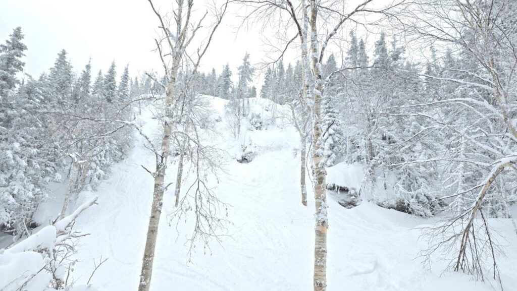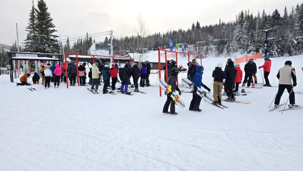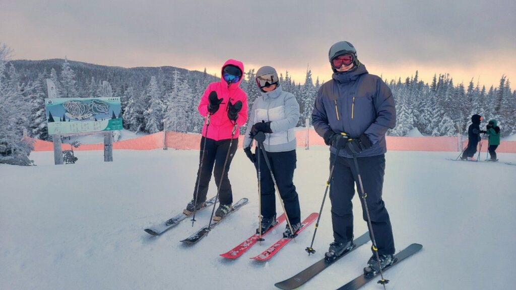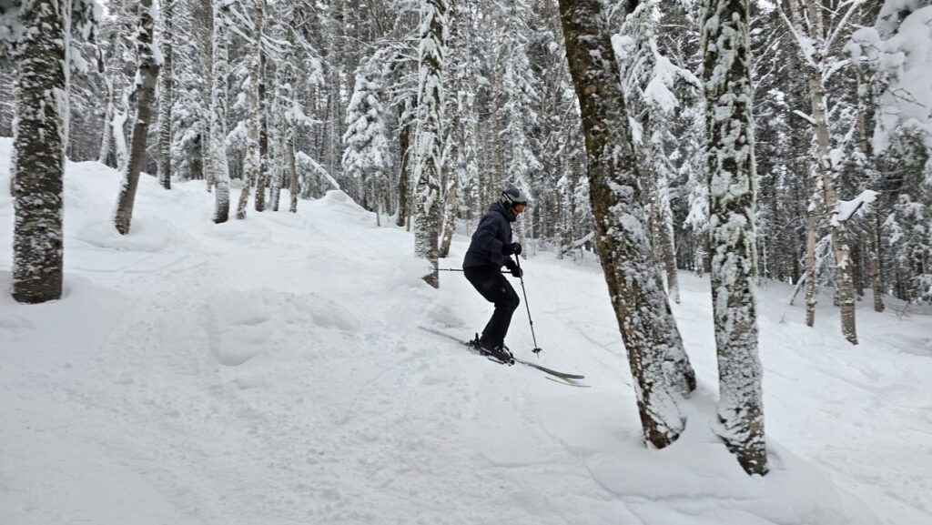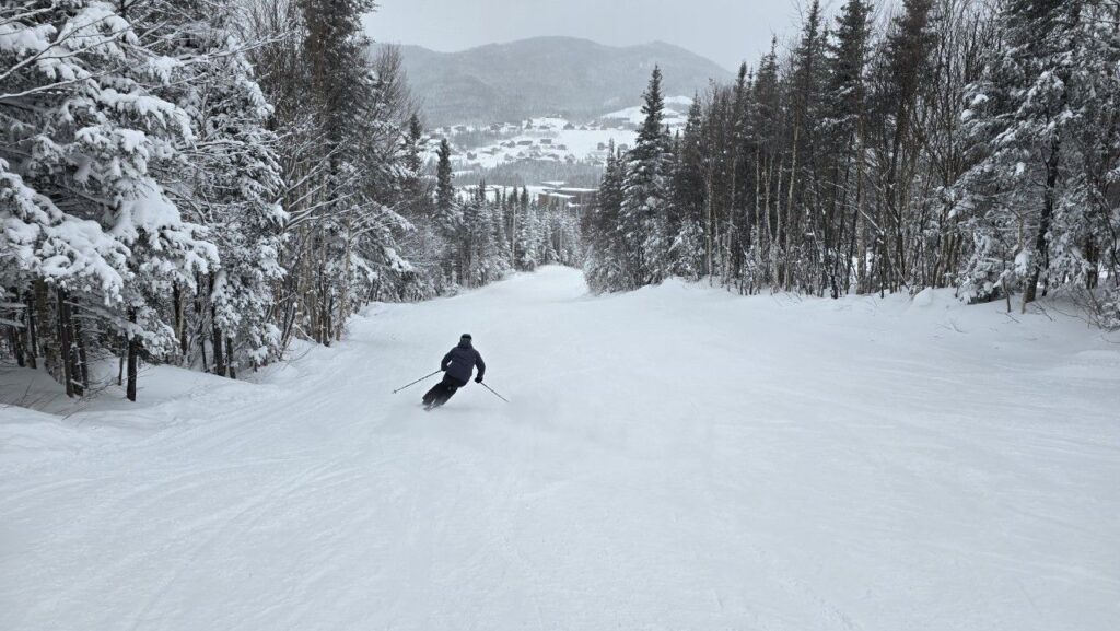 Une fois la première descente complétée, on se réajuste. On laisse filer les skis davantage dans la ligne de pente pour gagner de la vitesse, et voilà que le plaisir revient — même si le froid, lui, s’accroche.