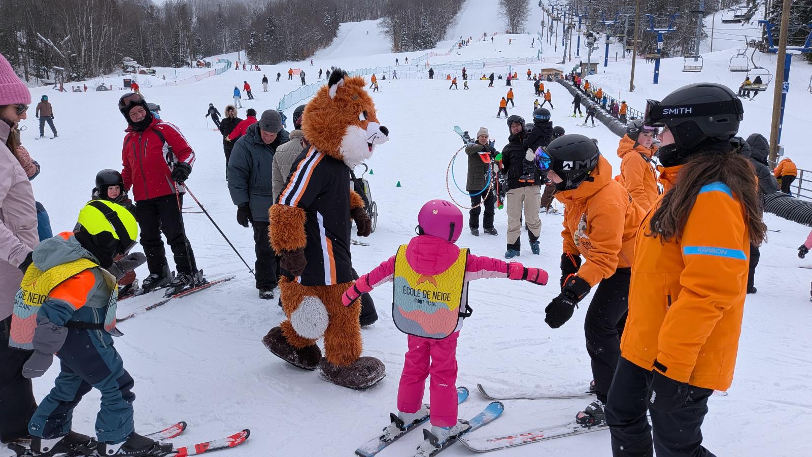 Malgré un thermomètre quelque peu récalcitrant, l’ambiance est à la fête au Mont-Blanc. Comme à toutes les fins de semaine, d’ailleurs. Ce n’est pas tant qu’il fait vraiment froid, c’est plutôt que l’absence de soleil se fait ressentir en humidité. N’allez pas croire que les visiteurs en sont pour autant retenus dans leur enthousiasme. Au contraire! D’ailleurs, une mascotte ça fait toujours chaud au coeur.