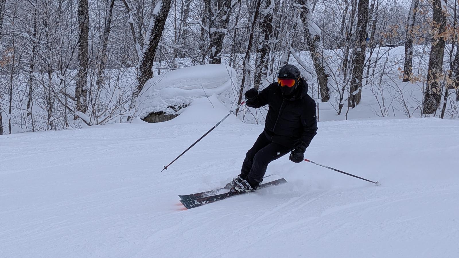 Pat Gervais met à l’essai une paire de ski « all mountain ». Révélation, dit-il! Et hop, un coup de coeur pour lui. Tout au long de la journée les conditions de neige demeurent très favorables, ce qui aide à bien tester les skis descente après descente.