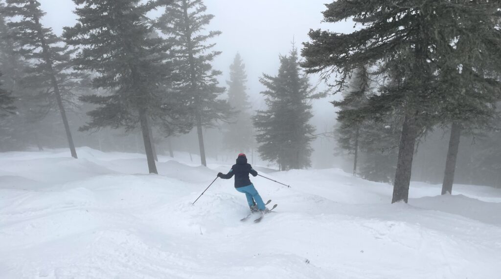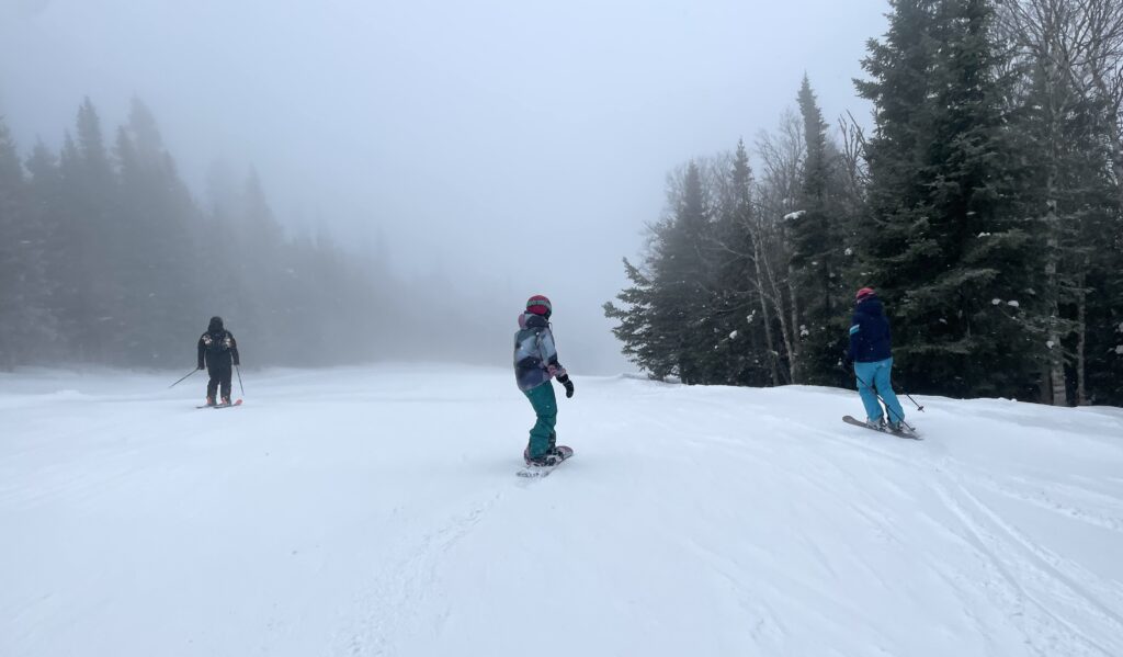 On a quand même réalisé une dizaine de descentes avant d’ajourner pour un lunch. Alors qu’on hésitait entre reprendre la séance ou la clore, on a remarqué que les skieurs qui rentraient dans le chalet avaient les épaules et l’avant des manteaux mouillés… il s’était mis à pleuvoir. Pas fort, mais juste assez pour nous convaincre de filer vers notre feu de foyer!
