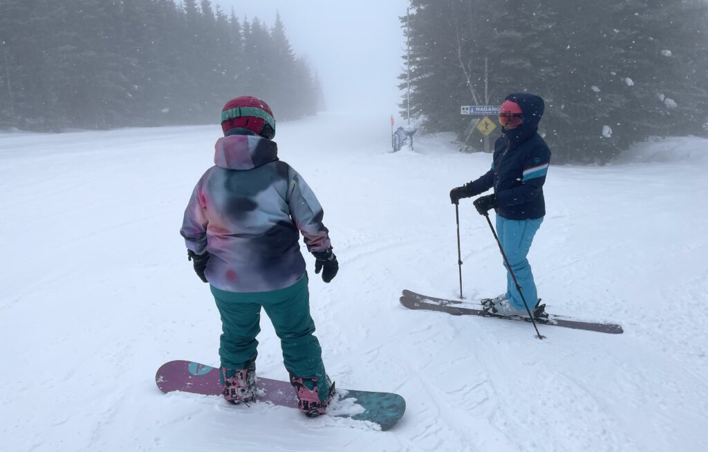 Aujourd’hui au Mont Grand-Fonds, c’était la journée des dilemmes! On commence par l’habillement… on s’habille comment quand il y a des risques que la neige se transforme en pluie, mais qu’il vente TRÈS fort? J’ai choisi un pantalon plus imperméable… et je suis allée rajouter une couche d’isolation après la première descente!