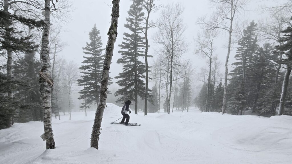 Deuxième dilemme: piste damée, ou sous-bois? L’une procure de superbes conditions de glisse sous les spatules, mais on a une faible visibilité, donc assez difficile de s’élancer en toute confiance. L’autre offre certes un répit du vent et une meilleure visibilité, mais la neige manque à certains endroits: les roches et souches commencent à se montrer suite au passage répété des skieurs fervents de ce type de piste. Les maigres 9 cm de neige enregistrés au compteur dans les 7 derniers jours ont eu tôt fait de disparaitre, surtout avec le vent d’aujourd’hui. Heureusement, le travail des pistes damées est, comme à l’habitude, impeccable.