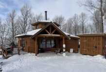 Ambiance conviviale. Tables de pique-nique et foyer à la base de la montagne près du chalet. On s’imagine au printemps…