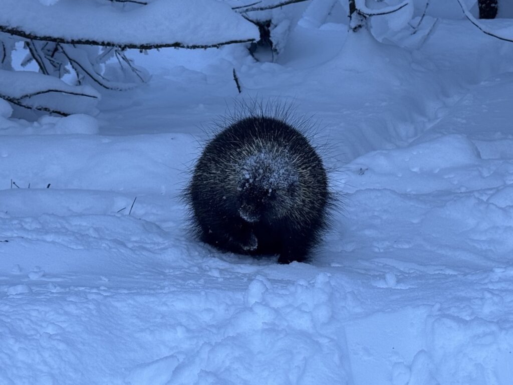 Fait inusité, un porc-épic se trouvait dans le sous-bois Orignal et se laissait même flatter avec nos bâtons!