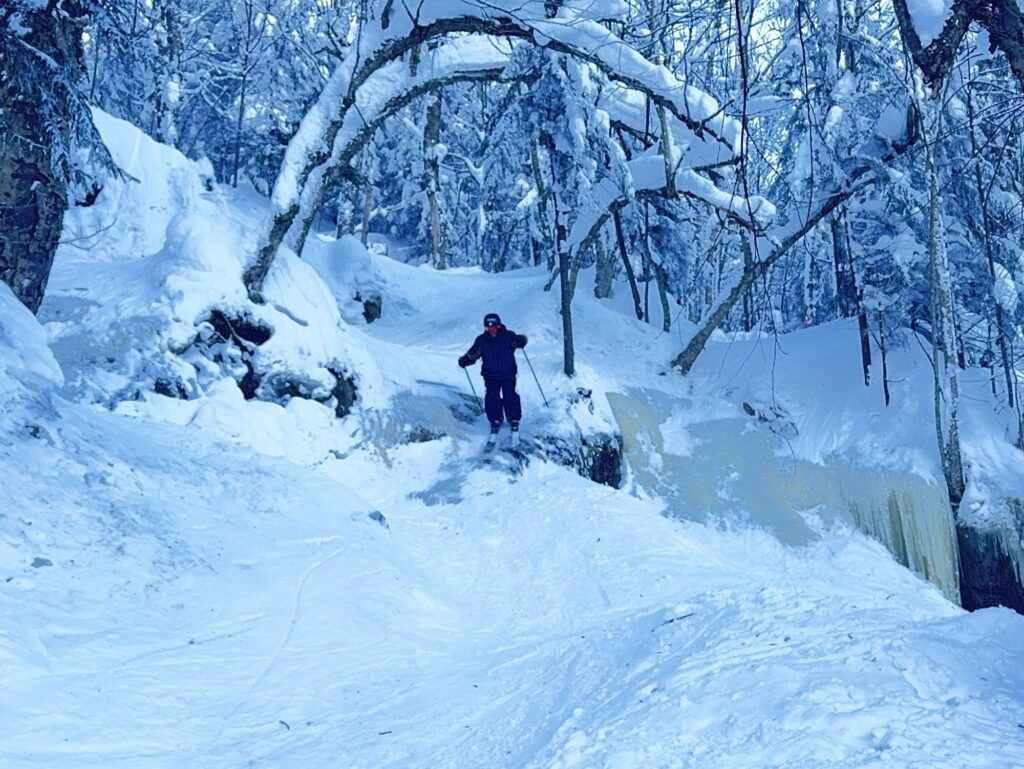Du côté des pistes à enneigement naturel, la couverture y est très bonne et fait surprenant pour Orford, les roches sont peu nombreuses cette saison, ensevelies sous une croûte de glace causée vraisemblablement par le verglas d’il y a quelques semaines. Il faut faire attention, par contre, aux quelques plaques de glace.