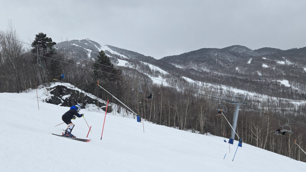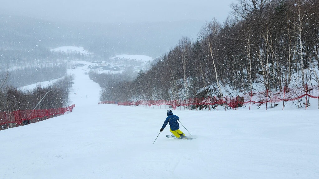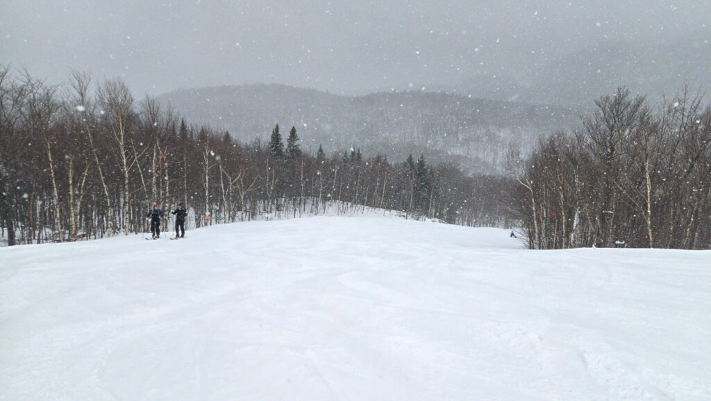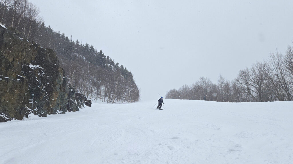 En ce lundi de Pâques pour irréductibles seulement, la neige était de retour en Estrie. De jolis flocons dignes d’un hiver encore bien présent comblaient les âmes en quête de bonheur. Tout au long de la journée, la ouate blanche nous a accompagné pour donner facilement 5-6 cm. Quand il n’y a qu’une poignée de clients, cette petite accumulation nous donne des virages plus qu’intéressants à chacune des descentes.