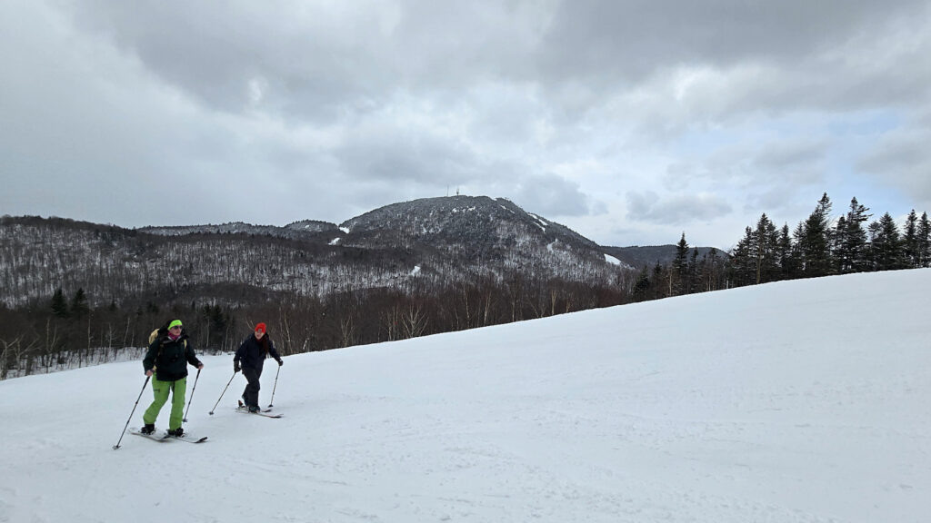 Selon mes observations peu scientifiques, il y avait probablement autant de skieurs de chaise que de grimpeurs à jus de jambe. Il m’avait été mentionné quelques fois durant la saison cette forte popularité à la station et à voir ceux présents aujourd’hui, je confirme sans aucun doute que c’est le cas. L’avantage d’une montagne comme Orford où il y a plusieurs pistes très larges est qu’on peut faire l’ascension à même celles-ci durant les heures d’opérations. En fin de saison, où évidemment le boisé n’est plus praticable, cette alternative est plus que la bienvenue.