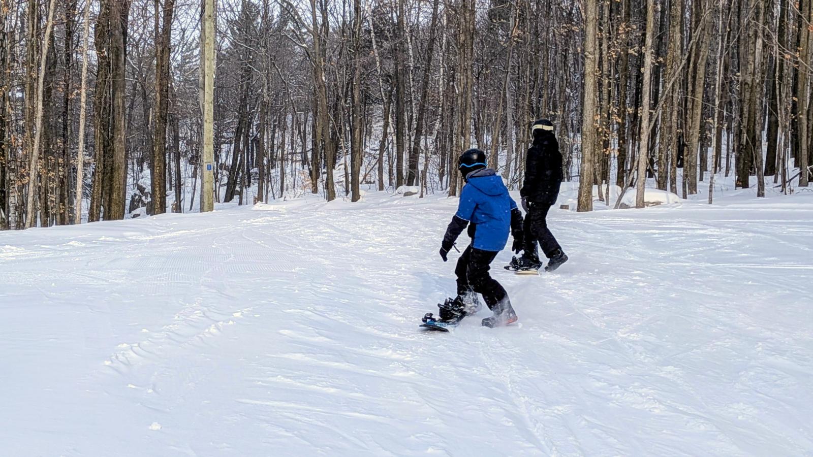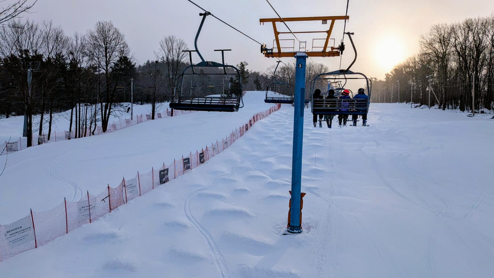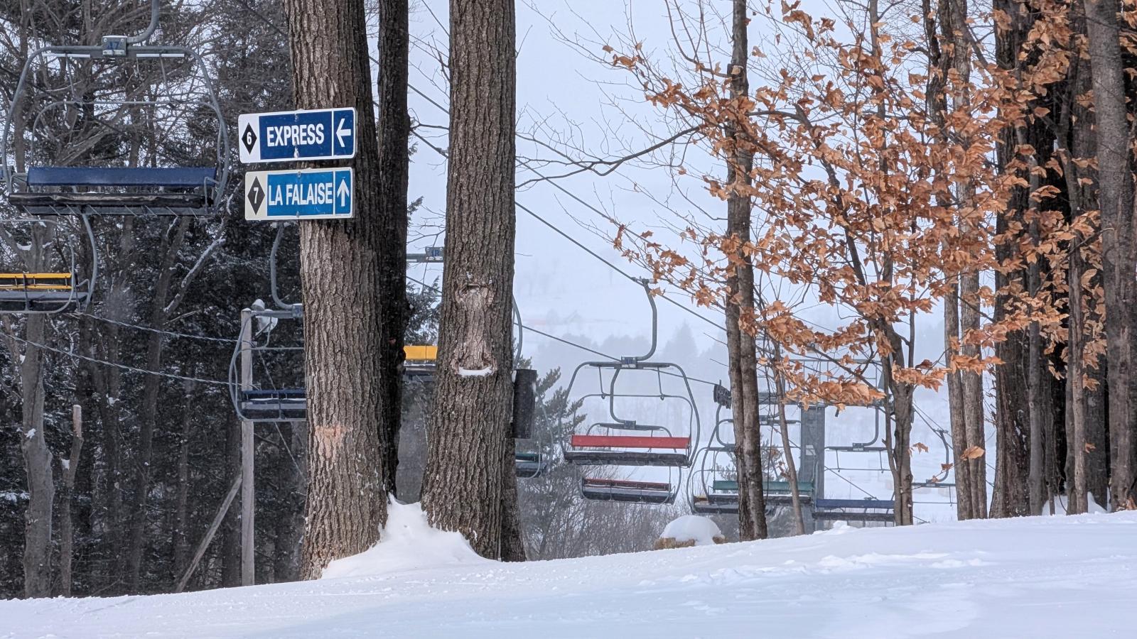 À l’horizon, les voiles de neige propulsées par des vents vigoureux masquent partiellement une vue autrement superbe sur la vallée de l’Outaouais. Les visiteurs présents aujourd’hui ne se plaignent pas des conditions météo; tout le monde est vêtu à la hauteur du climat. La neige accumulée dans les deux pistes noires de ce côté de la station nous laisse faire nos propres traces toute la journée, principalement sur les bords. Surprise assurée au moment de défoncer rapidement un amas de neige!