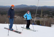 En arrivant au stationnement, on en profite pour repérer les canons. La Crête est en enneigement. Plusieurs skieurs ont bien hâte de glisser sur cette piste qui offre une vue unique sur le fleuve jusqu’à Québec, l’Île d’Orléans et les montagnes. La Gros Vallon est aussi en enneigement, mais on entend entre les branches qu’il y a un bris de conduite…