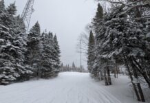 Versant expert, le côté Cheval Blanc est plus pentu. Une compétition occupe la Dustin Cook, que nous ne pourrons emprunter. Ici, on voit l’entrée de la Betsy. C’est la voie de contournement de niveau double losange, sans glace heureusement, qui nous permettra de rejoindre la base de la montagne. Pour terminer la journée, la Frank Pouliotte fait arriver directement au chalet de la base du versant Vanier et le stationnement, sans avoir à reprendre la navette. C’est les joues froides mais les pattes bien brûlantes que se termine notre journée à la montagne de l’Outaouais offrant le plus dénivellation.