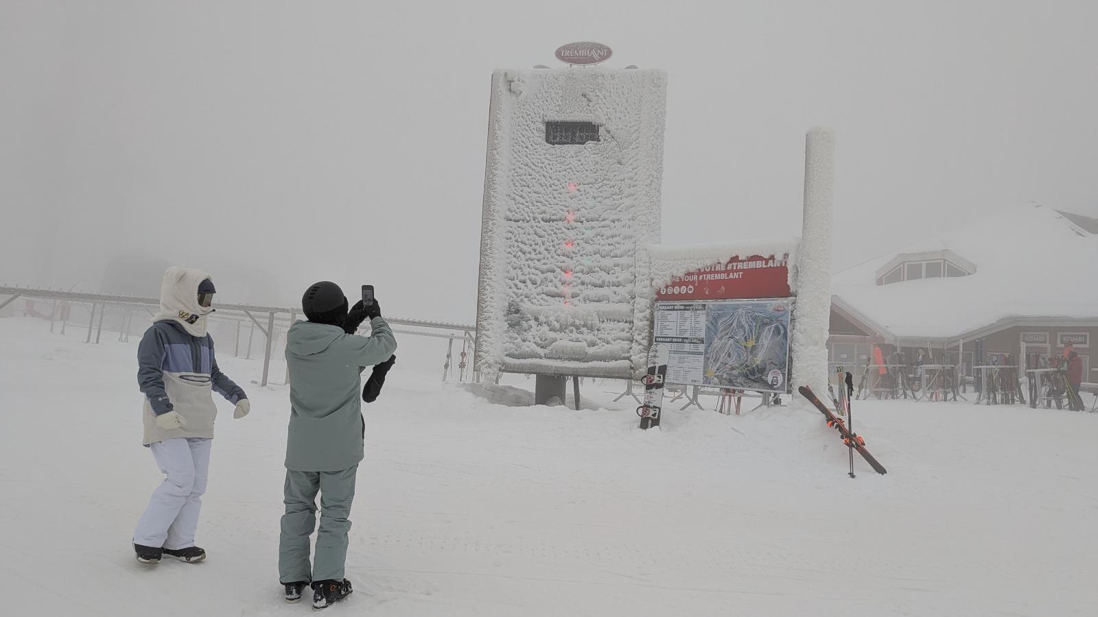 La pluie a été abondante durant la nuit. Quand le thermomètre est redescendu sous zéro, il a laissé son lot de givre épais et coriace. À l’ouverture ce matin, il reste les nuages à la base et la brouillard au sommet.