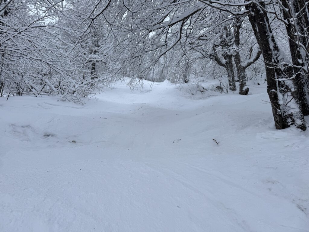 Du côté des quelques pistes à enneigement naturel et sous-bois ouverts, notez que la base naturelle fait tout au plus 30-40cm et que le verglas a fait une croûte. Les branches des arbres ont aussi souffert du poids de la glace.