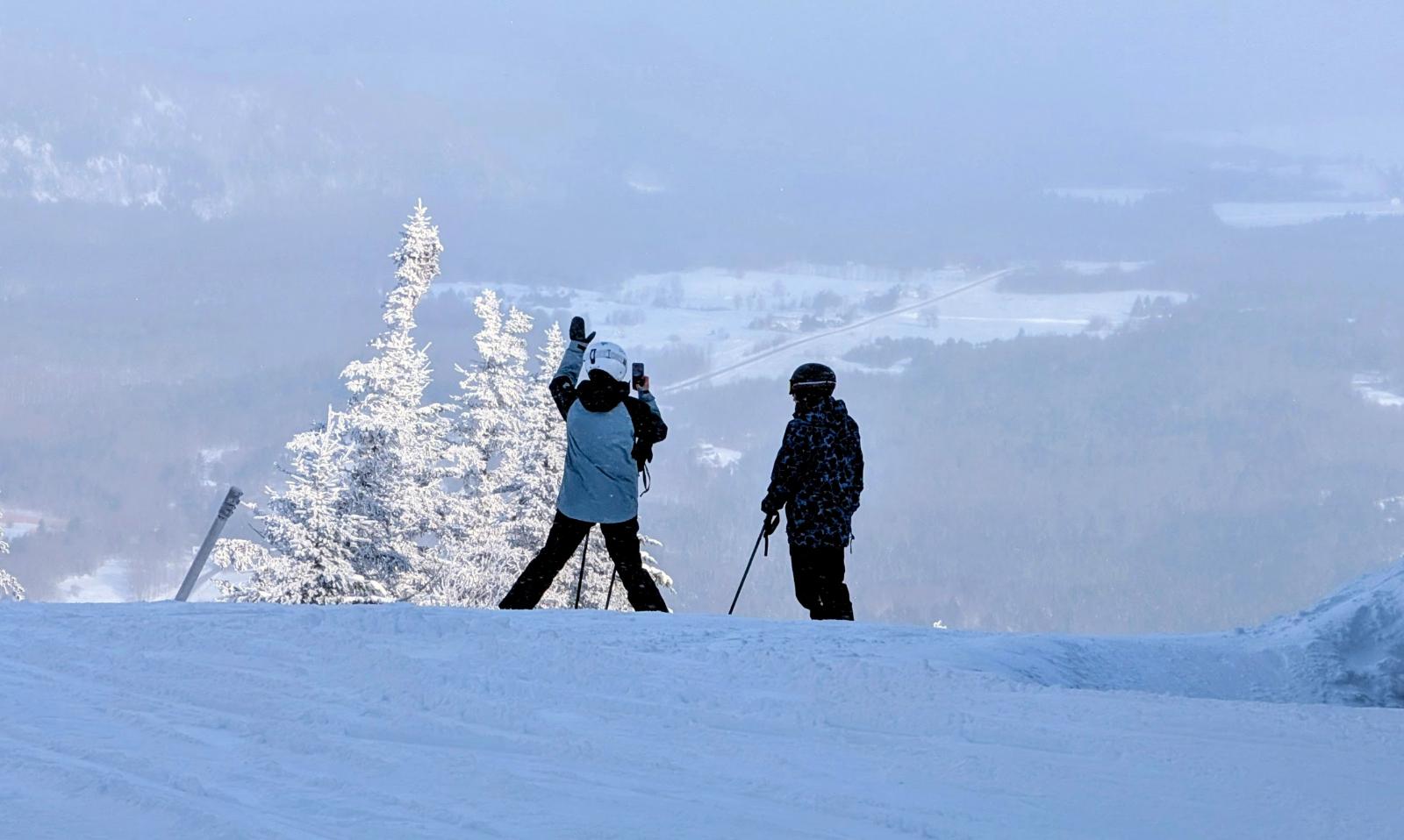Par moments, la visibilité est voilée par de très légers nuages qui achèvent de saupoudrer leurs derniers et timides flocons. Le contraste entre les cimes enneigées à proximité et l’horizon bleuté au loin donne envie de prendre des photos ou de rester planté là à contempler le spectacle. Et c’est précisément ce que nous offre Owl’s Head à chaque visite: des points de vue magistraux qui invitent à la contemplation, en plus de pistes qui appellent à se dépasser. Bilan de notre visite aujourd’hui: 5 heures de route, 12$ de recharge pour l’auto, 5$ pour un excellent café à la brûlerie Virgin Hill, un bon nombre de descentes excitantes et un immense plaisir renouvelé dans cette superbe station.