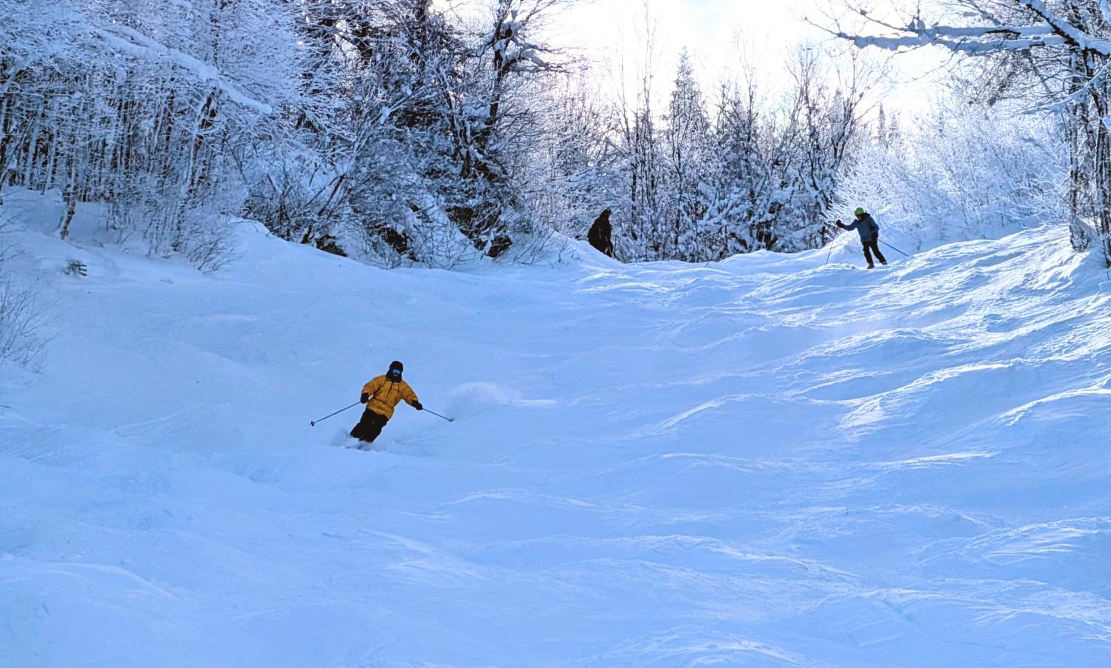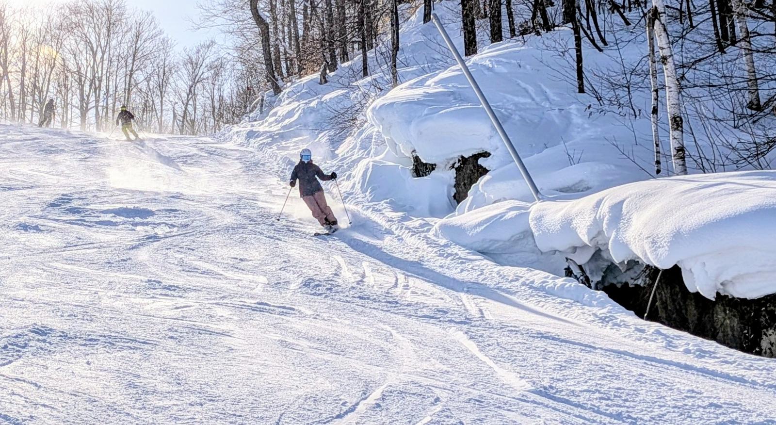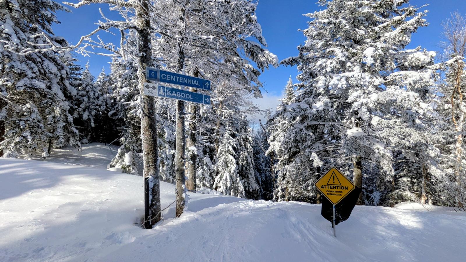 Malgré une couverture neigeuse relativement abondante, et quoi qu’adéquate, des sections de sous-bois sont découvertes. Rien de grave, mais il est bon de le savoir car l’enneigement naturel n’est pas partout égal sur le domaine skiable.