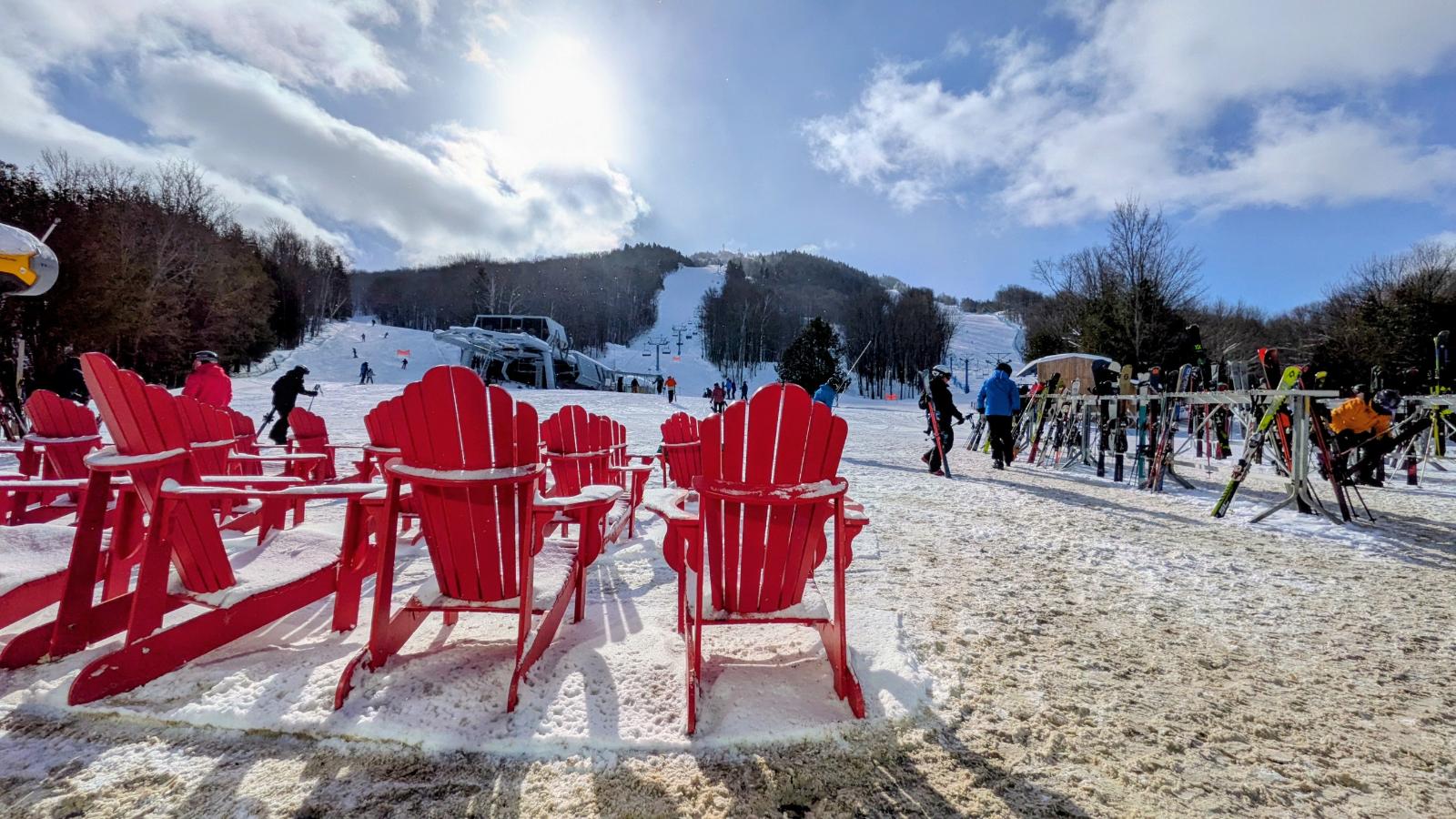 À la pause thé de 10h30, la température atteint son maximum de la journée: -8 degrés. Aussi bien dire printanier si on compare aux deux dernières semaines! Étonnamment, l’achalandage est considérable. On aurait pu croire (c’était mon cas…) que la station serait bien tranquille en ce « petit » jeudi. B’en non, il y a beaucoup de visiteurs même si aucune attente aux remontées ne trahit ce volume. Il faut lorgner du côté du stationnement pour réaliser combien Owl’s Head est populaire même en semaine. La présence du soleil y est sans doute pour quelque chose.