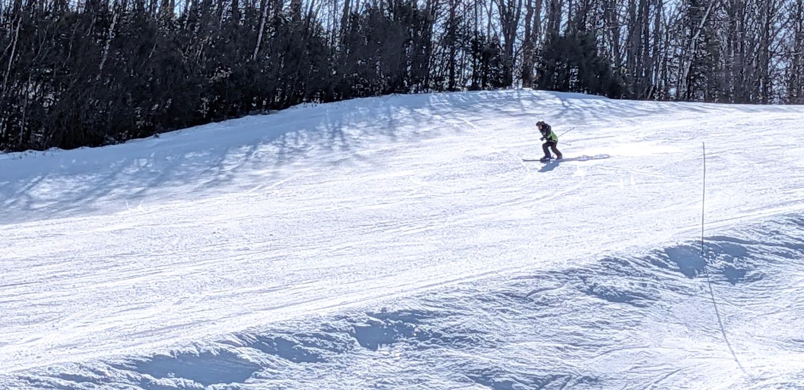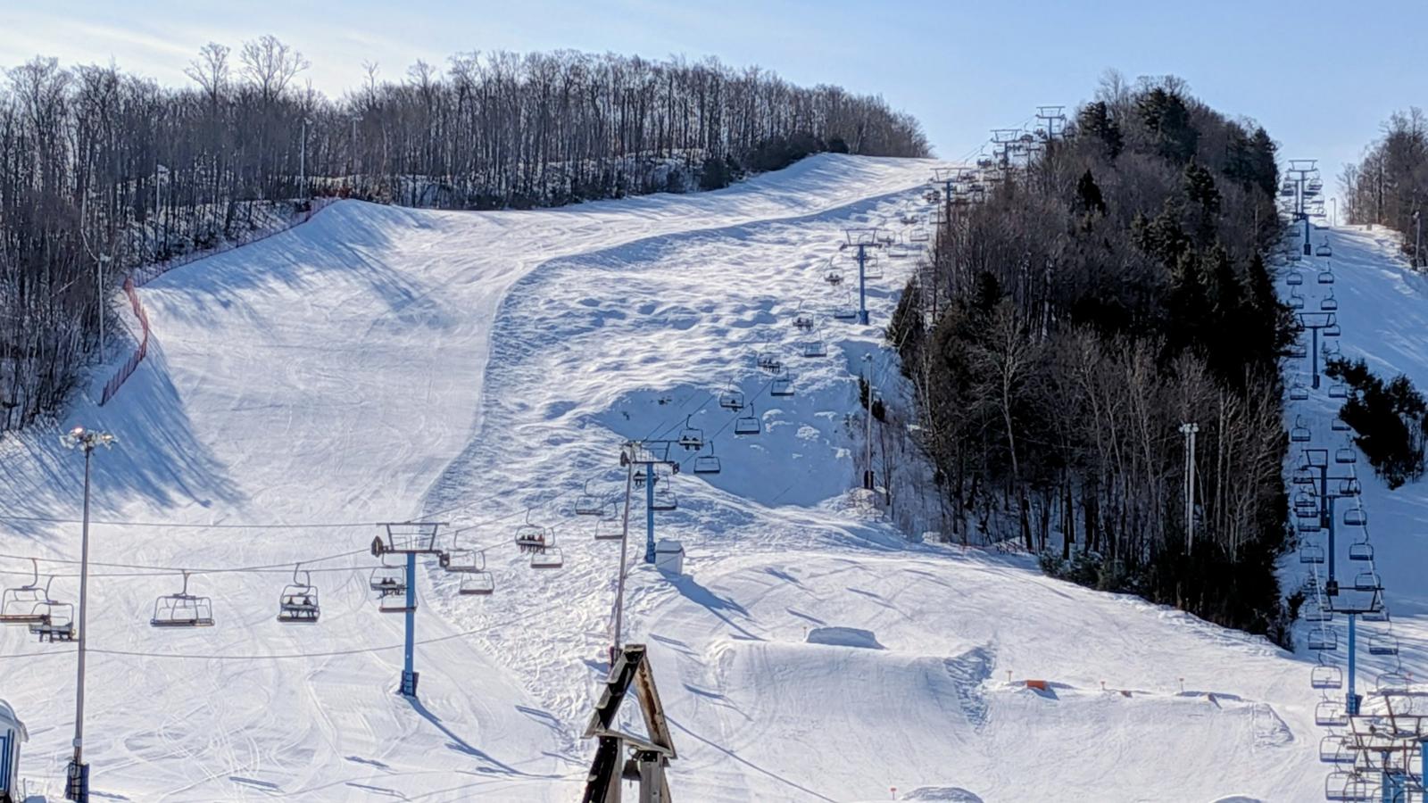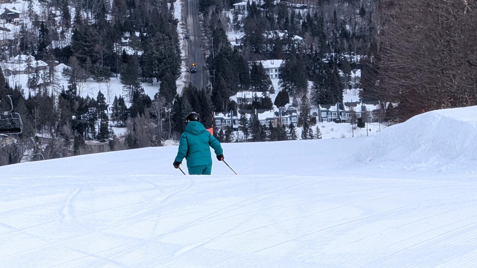 Sur le versant faisant davantage face au nord, les surfaces demeurent hivernales (et excellentes) longtemps durant la journée. Sur la photo, la piste Alexandre Despatie a de quoi surprendre les non initiés avec son inclinaison soutenue et sa ligne de pente en dévers.