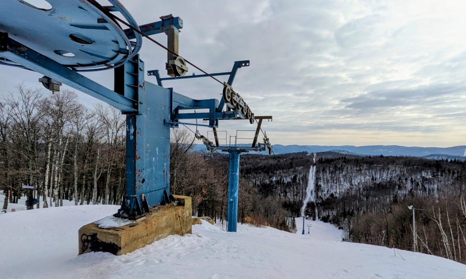 Vestige d’une époque où Ski Chantecler comptait quatre sommets, cette remontée à la retraite depuis belle lurette témoigne de l’ampleur du domaine skiable à son apogée. Pour preuve, la ligne verticale au loin. Il s’agit du tracé d’origine de cette vieille installation, baptisée La corde à linge. Peu de remontées mécaniques ont permis le transport des skieurs dans deux directions opposées en même temps. La lecture de l’article de Jacques Poulin (mentionné au premier paragraphe de cette chronique) en explique le fonctionnement. Unique!