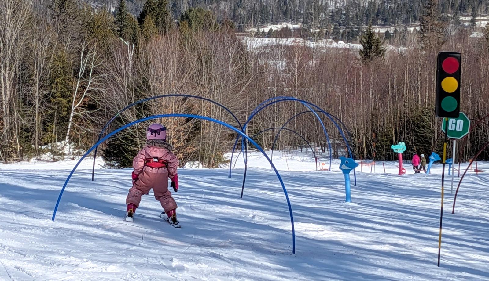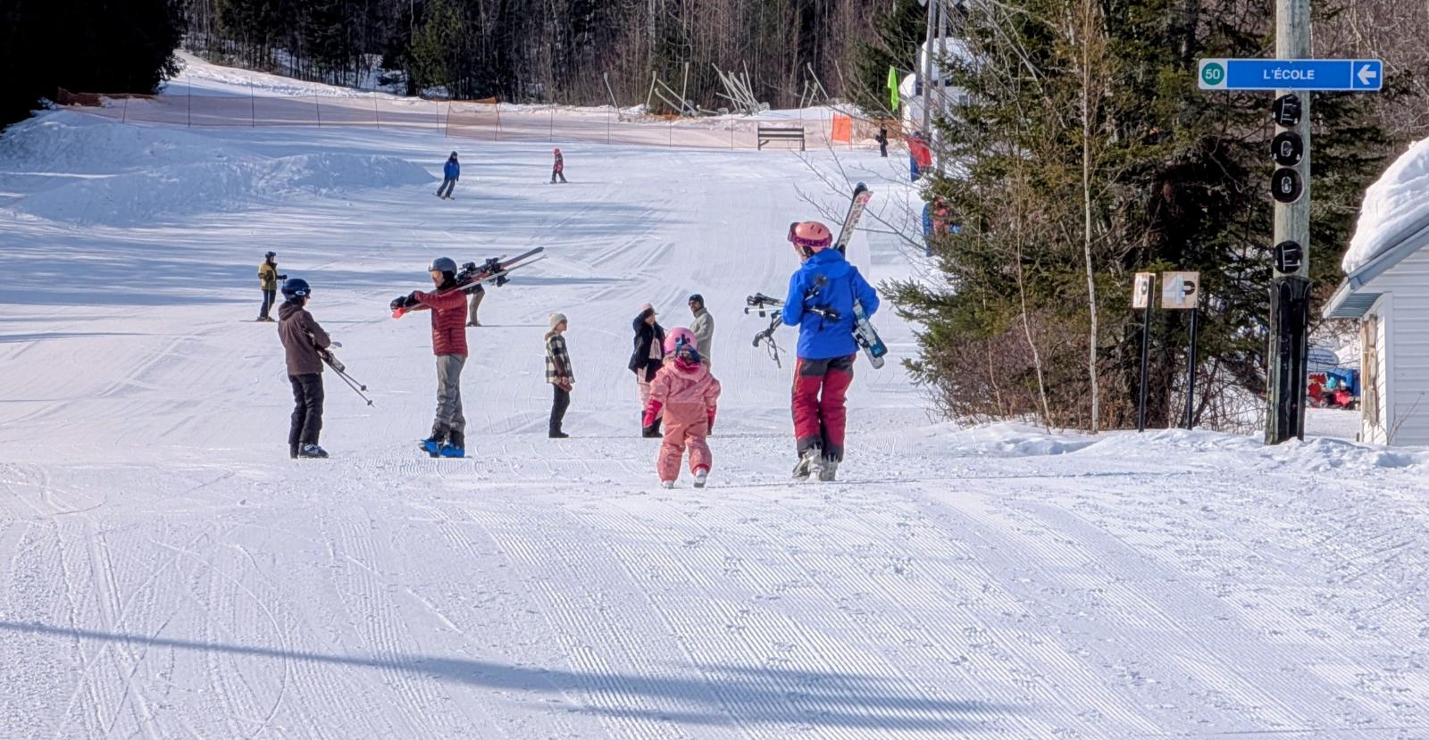 Le tapis magique de la pente école, il faut se le mériter! Situé à une courte distance de marche du chalet d’accueil, c’est en montant une très légère pente qu’on y accède. Les parents ont les mains pleines lors du trajet!