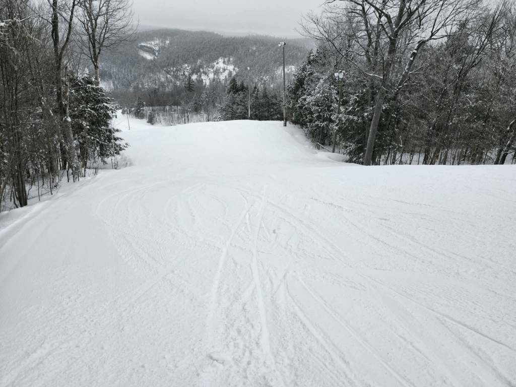 La surface damée était impeccable dans le bas de la Zoomer. Mon coup de cœur : la descendre par sa portion plus inclinée, tout près des arbres, du côté ouest (à gauche sur la photo ci-haut).