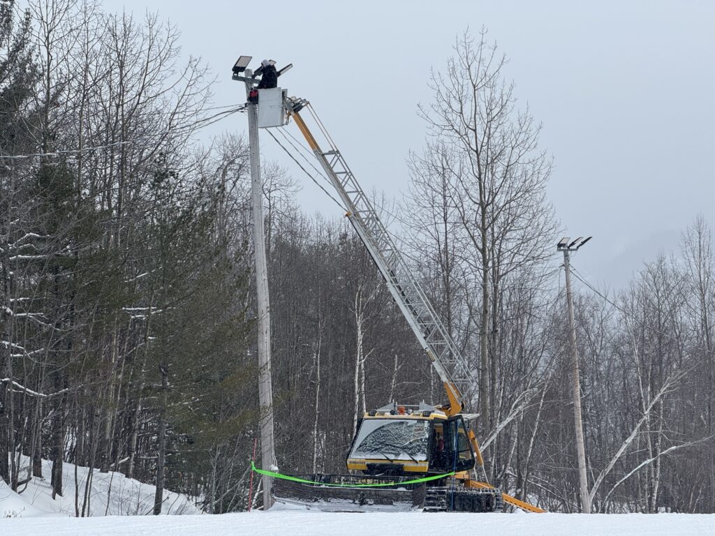 Nouveauté cette année, la station a entrepris une conversion au DEL de l’éclairage pour le ski de soirée sur la majeure partie des pistes. Une équipe technique s’affairait justement à cette tâche dans la piste Gollé aujourd’hui.