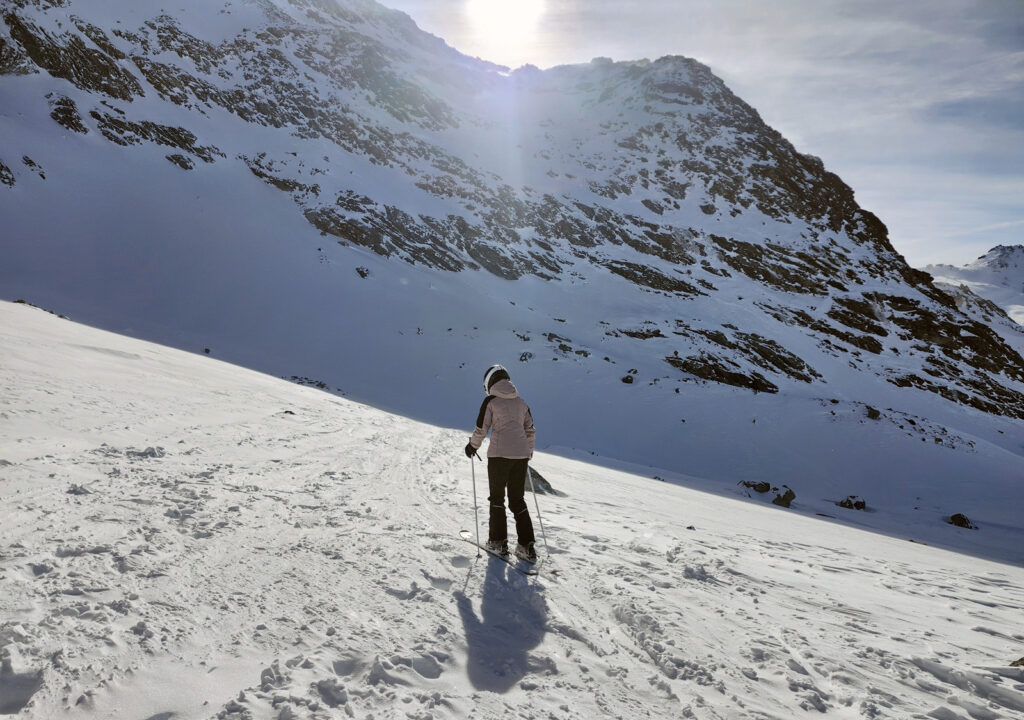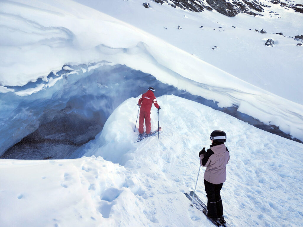 Sur le chemin du retour depuis Val Thorens vers le secteur d’Orelle, nous avons emprunté la piste Christine en compagnie d’un guide de l’ESF, avec un objectif bien précis: aller jeter un œil à la caverne de glace nichée sous le glacier du Péclet. Une petite escapade hors des sentiers battus qui ajoute une touche d’aventure à cette traversée déjà spectaculaire.