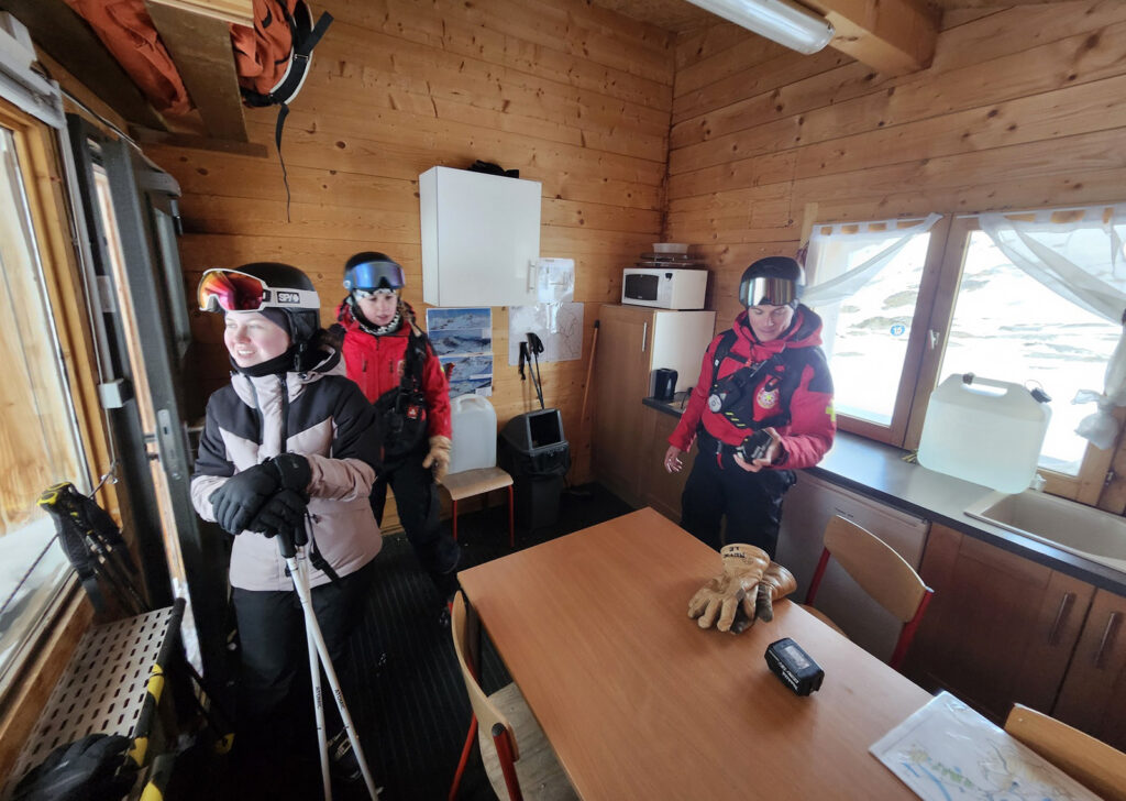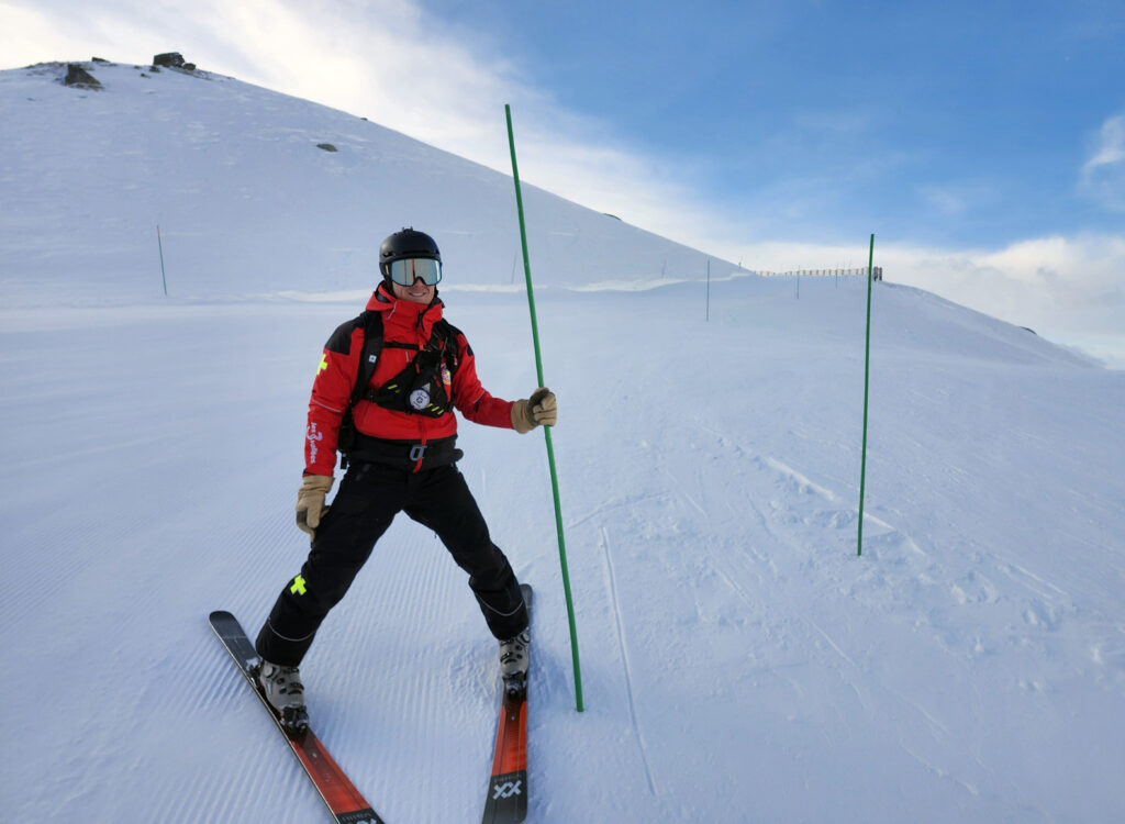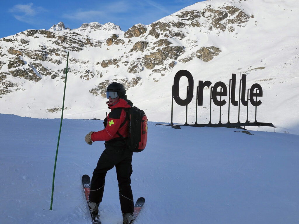 Rendez-vous à 8h15, sur la place de la télécabine à Orelle. Nous embarquons avec toute l’équipe de pisteurs-secouristes, encore seuls sur le domaine. Ce matin-là, nous suivons Lorenzo, qui nous explique les multiples facettes de son métier: secouriste, technicien de terrain, mais aussi artificier, chargé du déclenchement préventif des avalanches.