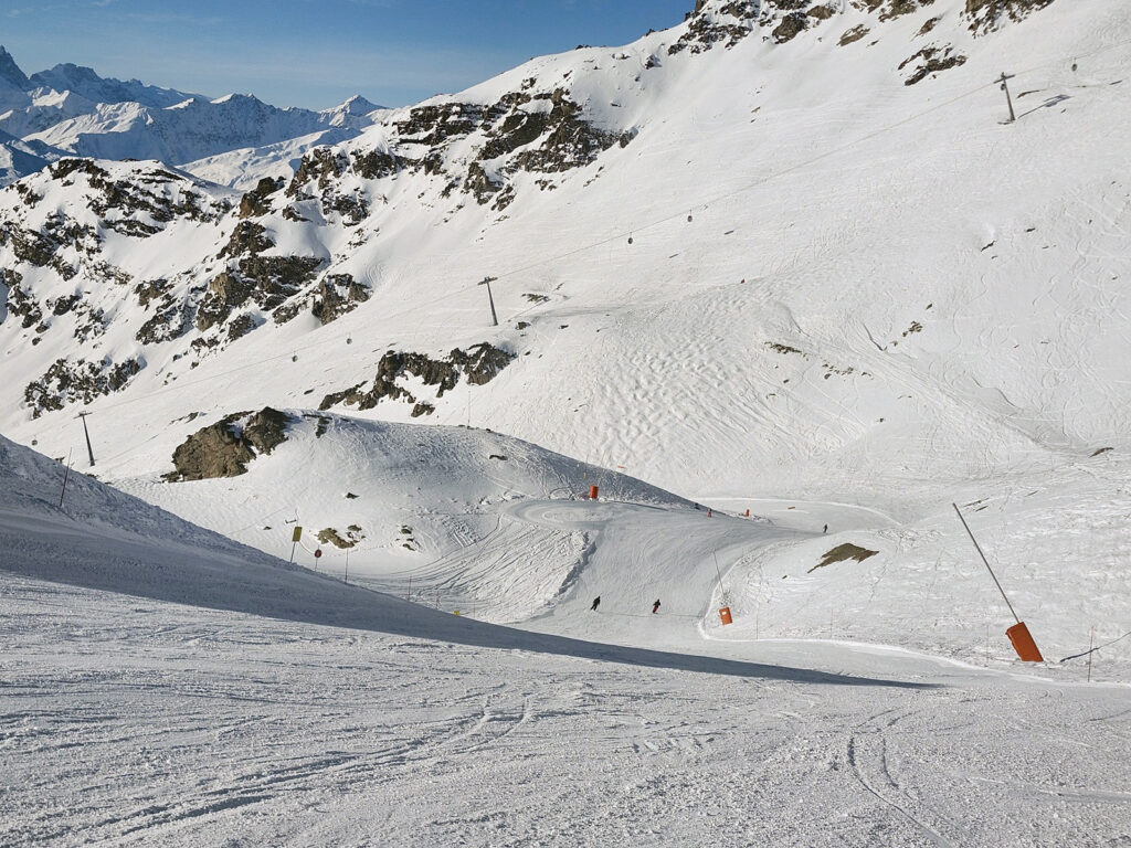 C’est l’une des descentes les plus grandioses du secteur. On s’y sent isolé, loin des remontées, presque comme en hors-piste, alors qu’il s’agit d’une piste facile et parfaitement tracée. La Lory débute sur une arête marquant la frontière naturelle entre Val Thorens et Orelle, puis serpente dans une vallée sauvage, suivant simplement le relief naturel du terrain jusqu’à Plan Bouchet.