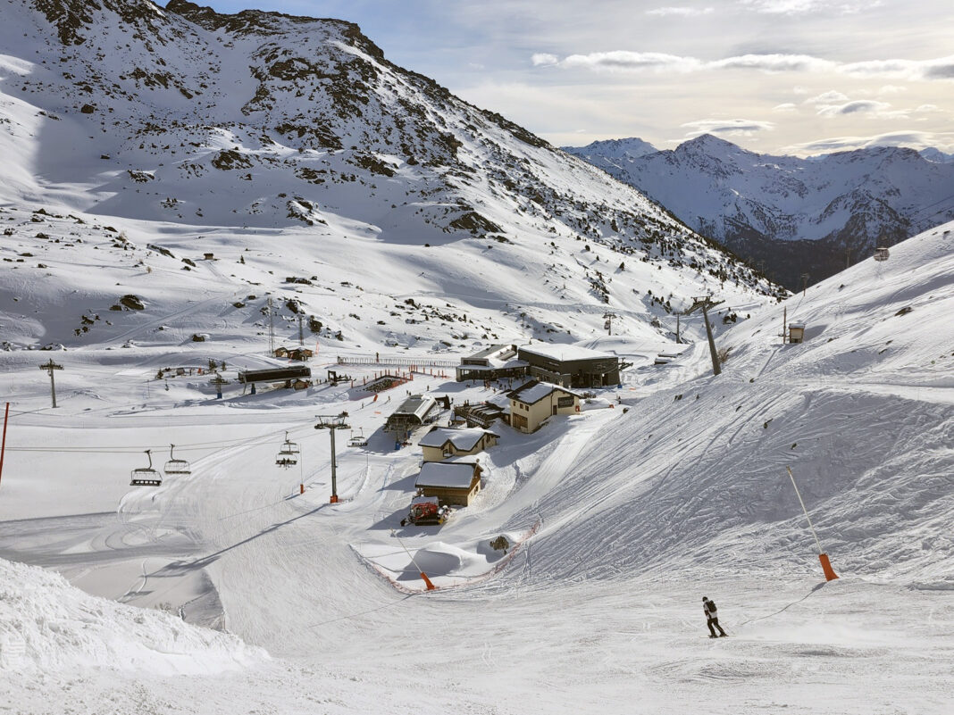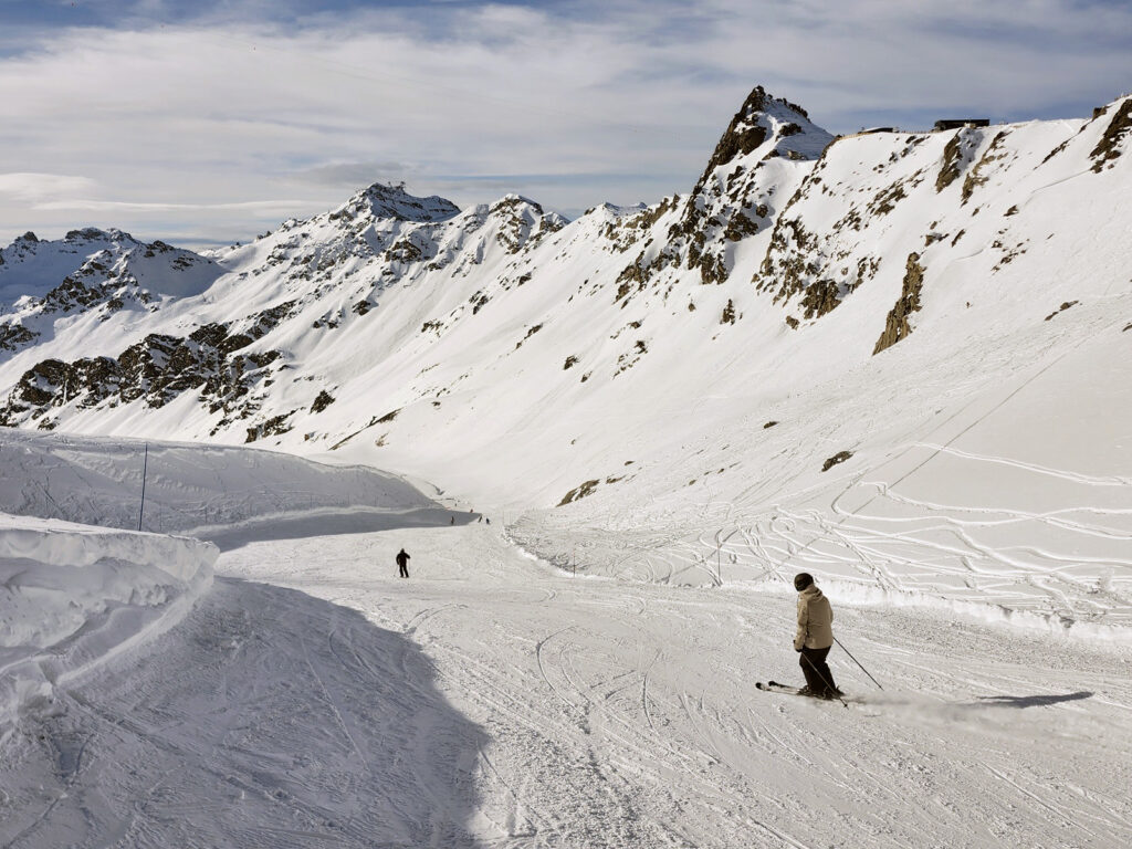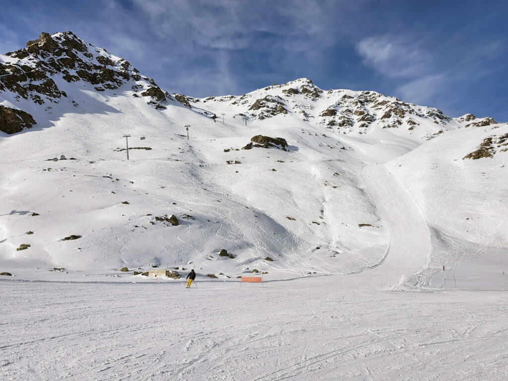 La télécabine d’Orelle nous dépose à 2 300 mètres, à Plan Bouchet (notre image d’entête), le front de neige de la station. On y skie de novembre à mai, malgré une orientation plein sud. Ici, l’altitude fait toute la différence.