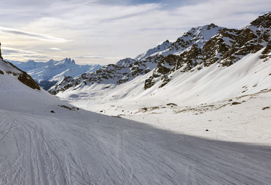 Toujours dans la piste Lory, avec vue au loin sur les Aiguilles d’Arves, les 3 pics qui ont inspiré le logo de la compagnie Évian.