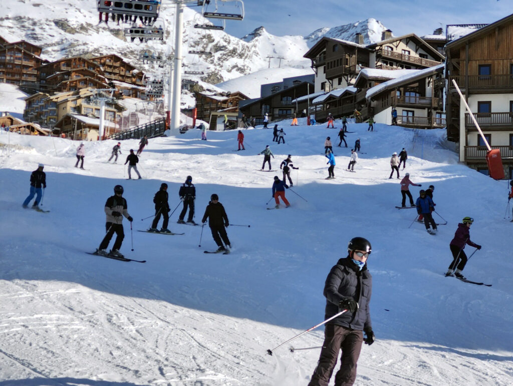 Sous le télésiège Plein Sud, piste facile mais très achalandée aux environs du Club Med de Val Thorens.