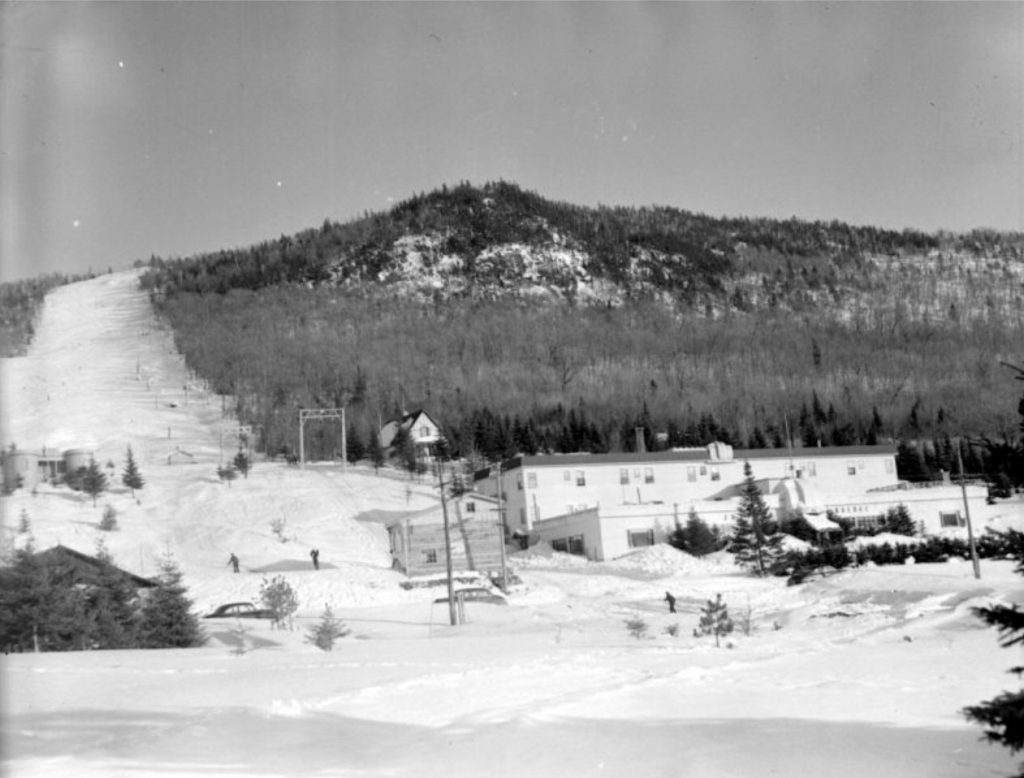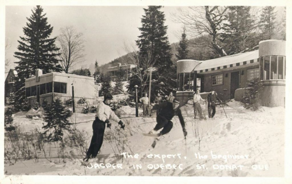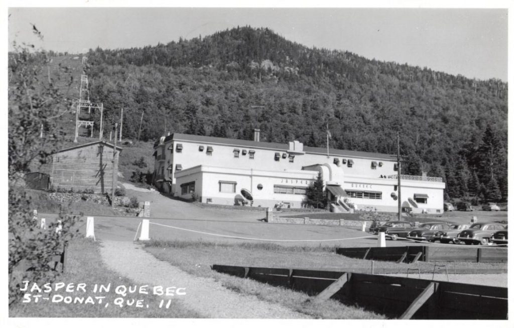 L’hôtel Jasper in Quebec était situé au pied des pistes et il a ouvert en 1939. La guerre a certainement retardé la date d’ouverture de la station de ski, qui n’est pas connue avec précision, mais qui selon un article de journal, était en opération à l’hiver 1946-1947. Le premier propriétaire Georges Fusey, d’origine Suisse. Il y avait alors une remontée mécanique, mais on ne précise pas de quel type. Le premier nom de la station a été le Mont Sunset, nom que j’ai vu dans un journal pour la dernière fois en septembre 1952. Par la suite, le nom Jasper in Quebec a été utilisé. Voici 3 photos (BAnQ) de l’hôtel dans les années 1950. Sur la troisième photo, on parle de l’endroit comme de la Capitale du ski dans les Laurentides. C’était du marketing à son meilleur.