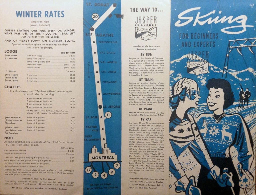 Si à une certaine époque, cette station de Lanaudière attirait les skieurs d’en dehors du Québec, aujourd’hui ce nom est inconnu de la majorité des skieurs. Jasper in Quebec était située à Saint-Donat sur le mont Jasper, le long de la route 329, et faisait face au lac Archambault. Pour ce qui est du nom, on en utilisait deux, Jasper in Quebec pour la clientèle en général, et Jasper en Québec pour la publicité dans les journaux francophones. Voici 3 épinglettes montrant que c’était ouvert en été comme en hiver.