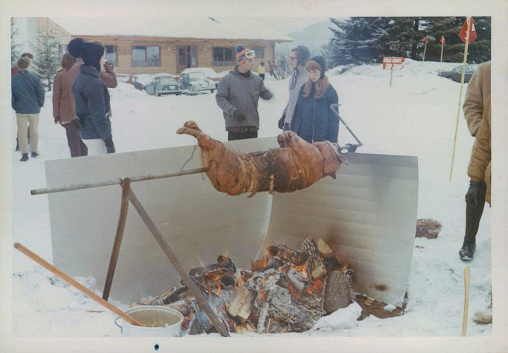 Voici quelques photos de patrouilleurs de la station, et deux activités de fin de saison, soit un méchoui et la remise des médailles des courses. La personne en avant sur cette photo est M. Y. Rajotte, un des copropriétaires de la station. En blague, on lui a donné une médaille en tôle.