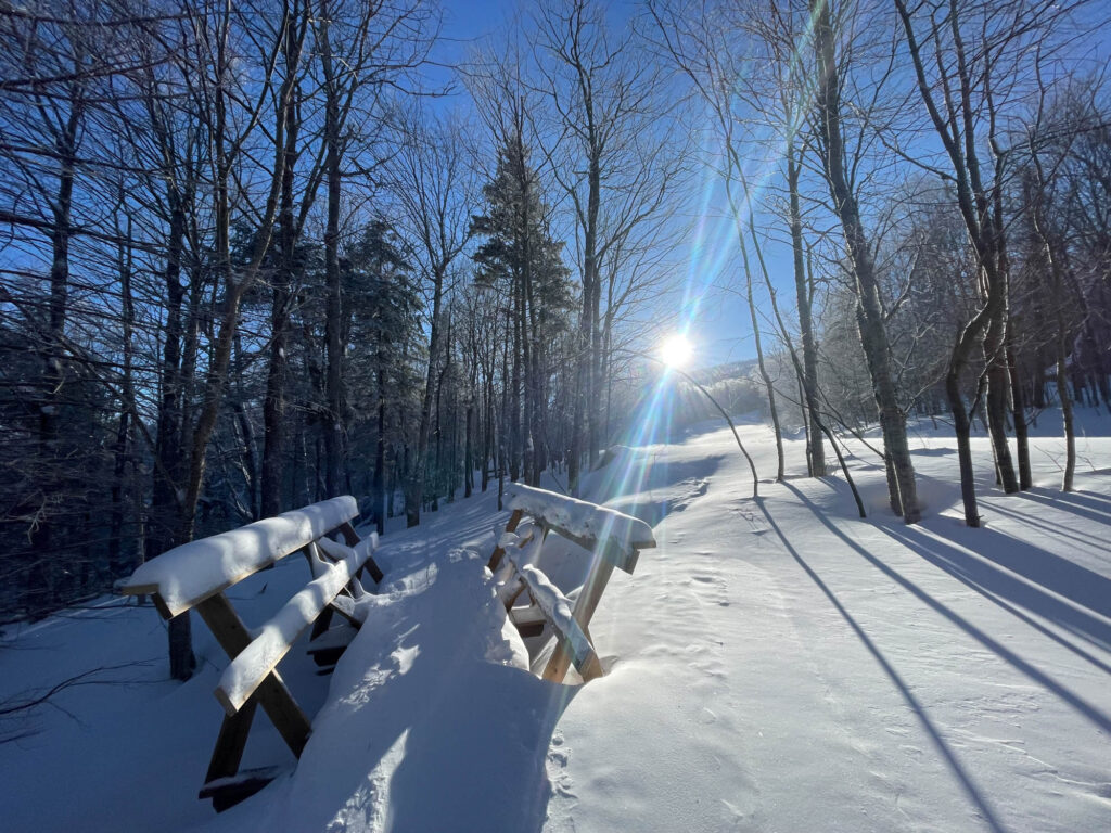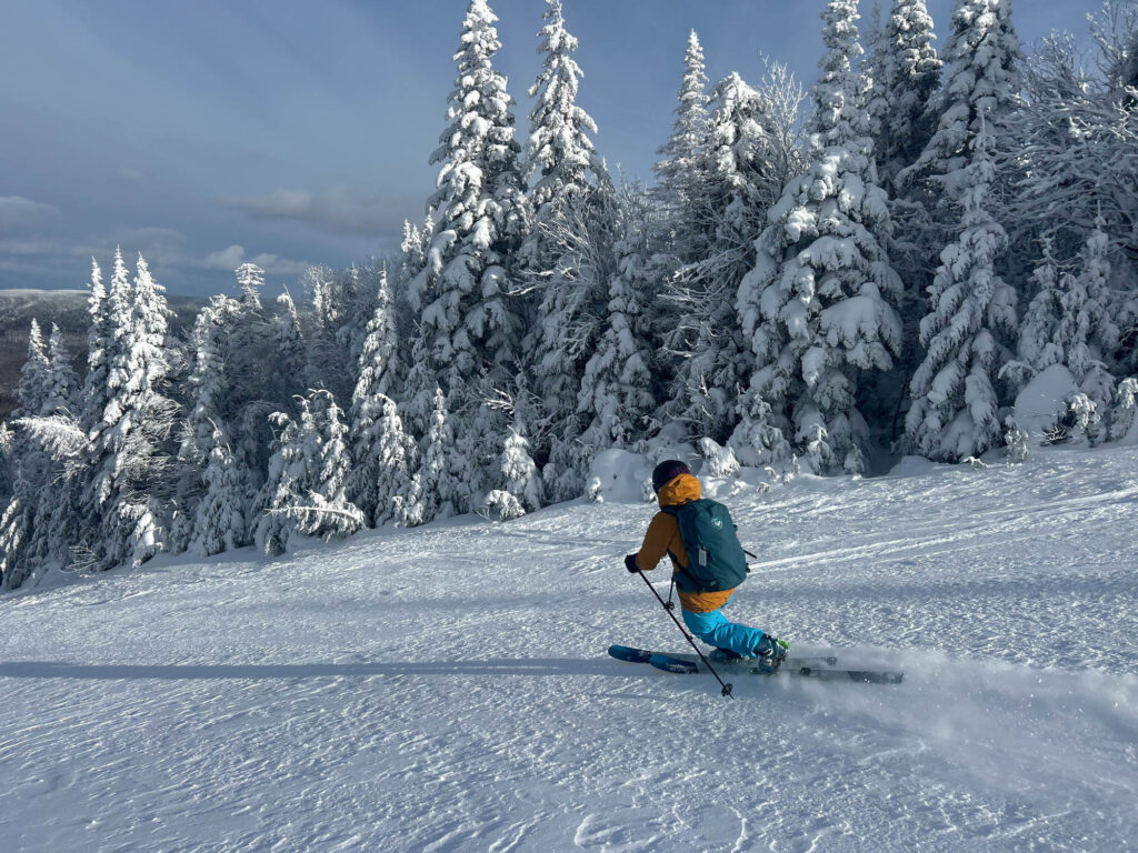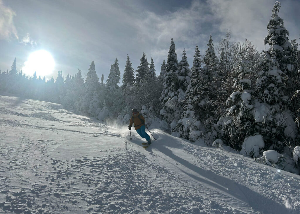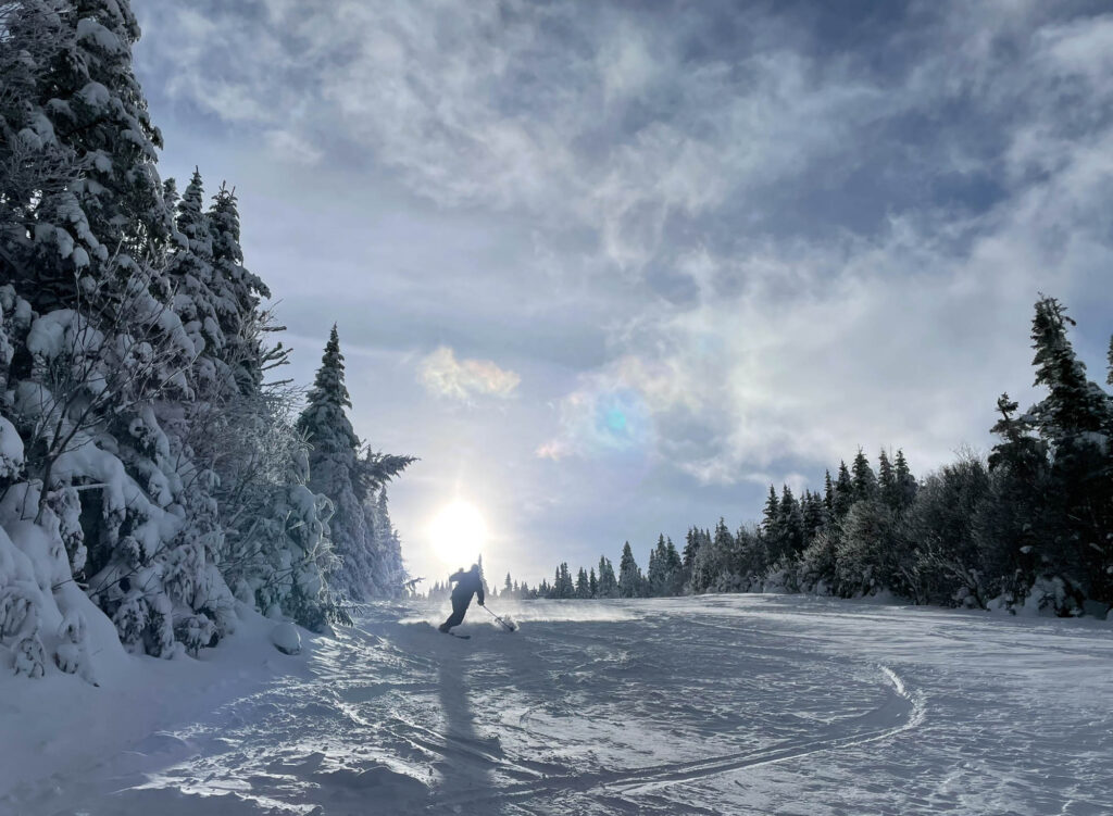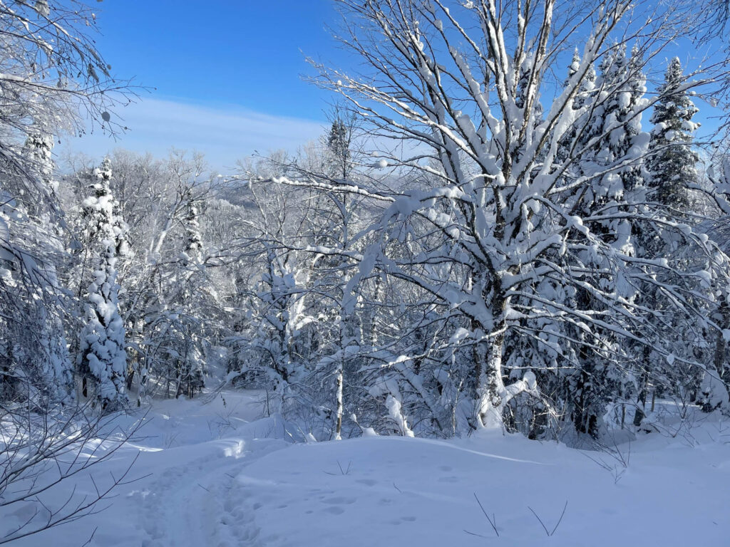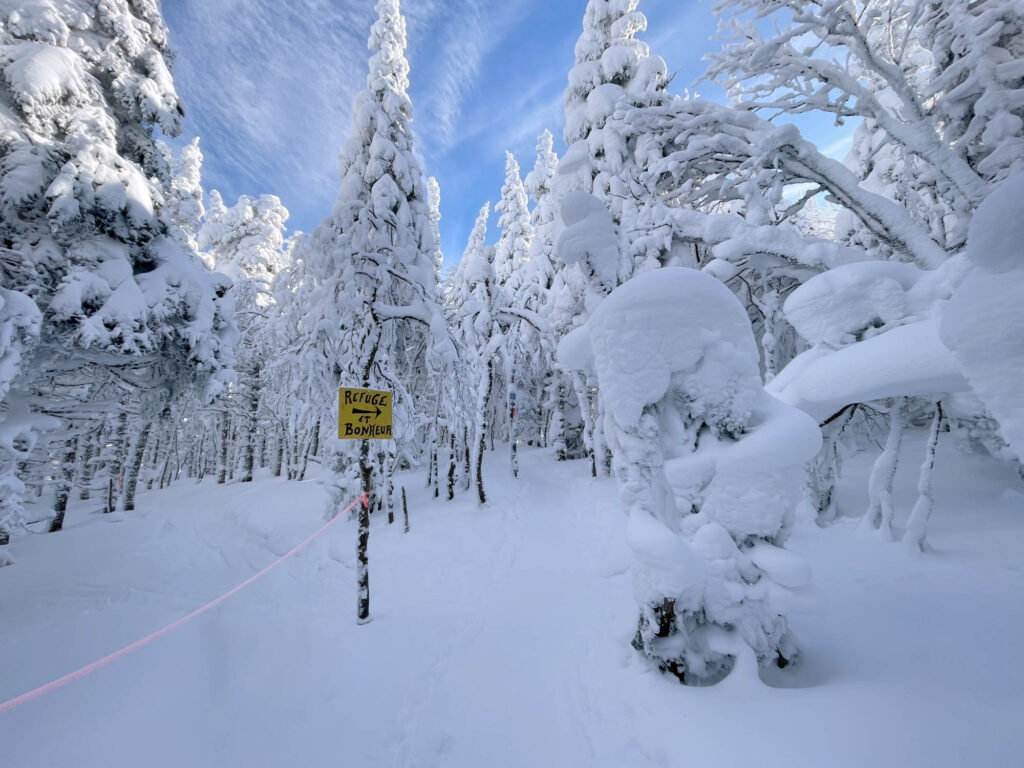 Lors de mon passage, il faisait un solide -18°C et les bourrasques de vent étaient bien présentes. Heureusement, l’ascension se fait dans des secteurs boisés, serrés et protégés, donc on est relativement à l’abri. Le paysage était féérique, la station est choyée par les chutes de neige cette année, ce qui donne des points de vue magnifiques et des conditions sublimes en descente. J’ai fait les sentiers A et C, et descendu un sous-bois (8) et une piste ouverte (10). Mon temps d’ascension a été assez similaire pour chaque sentier, entre 1h15 et 1h20. Chaque arrivée au refuge est accompagnée de fierté, de fatigue, et d’un soulagement de pouvoir se changer tranquillement dans un espace chauffé. C’était une belle demi-journée dans la montagne, parfaite pour oxygéner les neurones et profiter d’un moment zen.