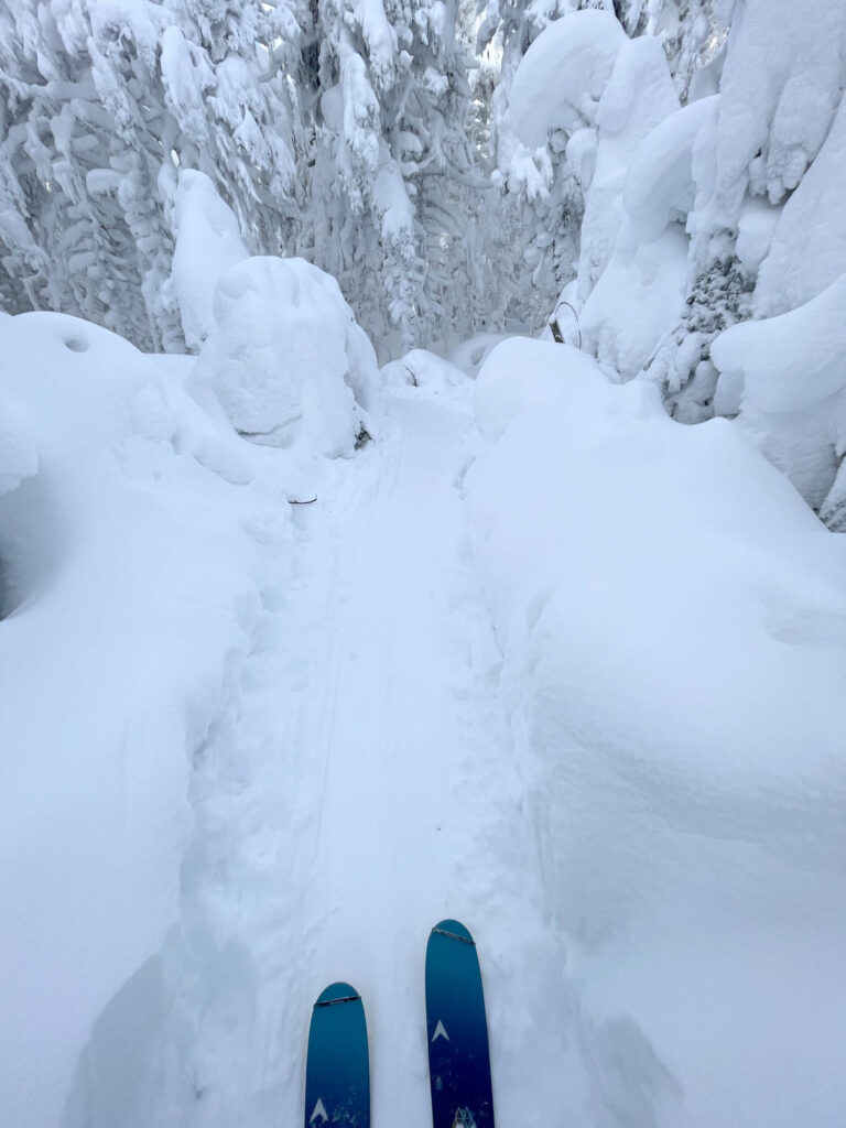 Les arbres chargés de neige rendent le passage des yétis plus laborieux à certains endroits! Ici, le haut de la 8 (Cathédrale).